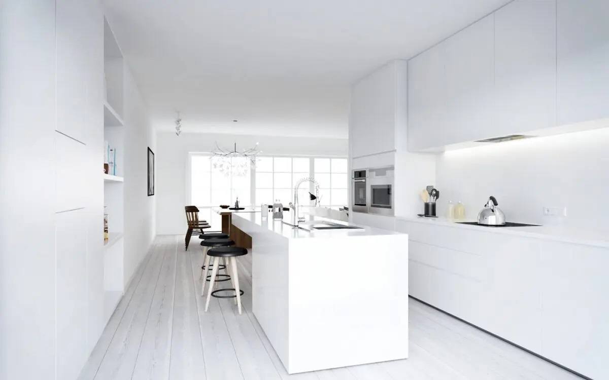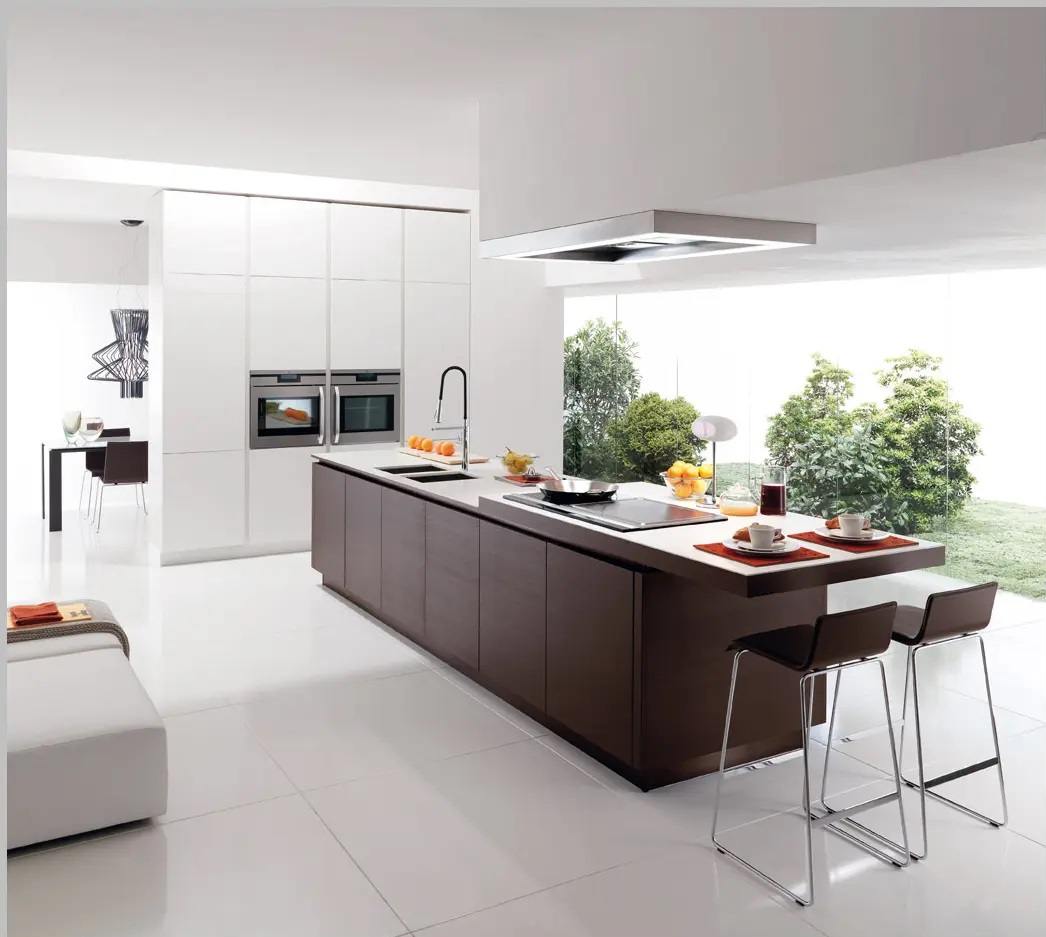 Por último, la apuesta por el Blanco total, líneas limpias, geometrías precisas y volúmenes al mínimo. Muy pocos toques de color, sobre todo el negro o marrón de las sillas y taburetes y los pocos accesorios expuestos. Una cocina que es el sueño de todo amante de las líneas minimalistas y futuristas , perfecta incluso para ambientes con poca luz , porque la presencia masiva del blanco captura los rayos del sol y los refleja por todas partes. La isla central es un bloque rectangular que, en un punto del centro, termina como superficie suspendida , dando un gran dinamismo a una cocina que en sí misma es muy compacta.