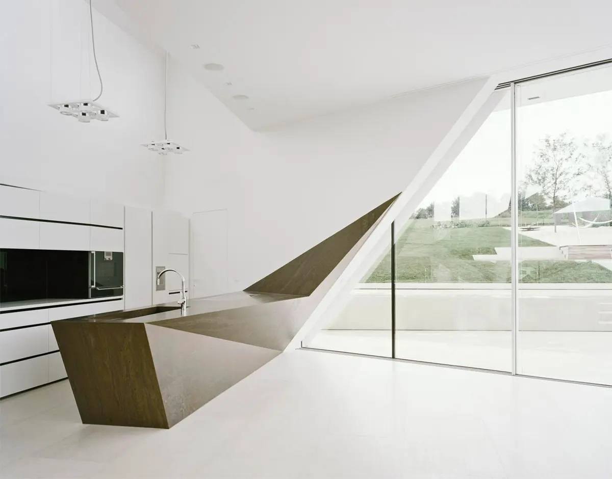 Si queréis ideas que os sorprendan, nada como elegir esta otra manera de colocar la mesa de la cocina. Una cocina que parece desafiar las leyes de la física dado que tiene una mesa de comedor integrada que se apoya sobre superficies irregulares dotando al desorden de un cierto orden geométrico y preciso . Los volúmenes son dinámicos, la mesa central integrada parece el resultado de la intersección de diferentes formas geométricas , las diferentes caras reflejan la luz y dan aún más movimiento.