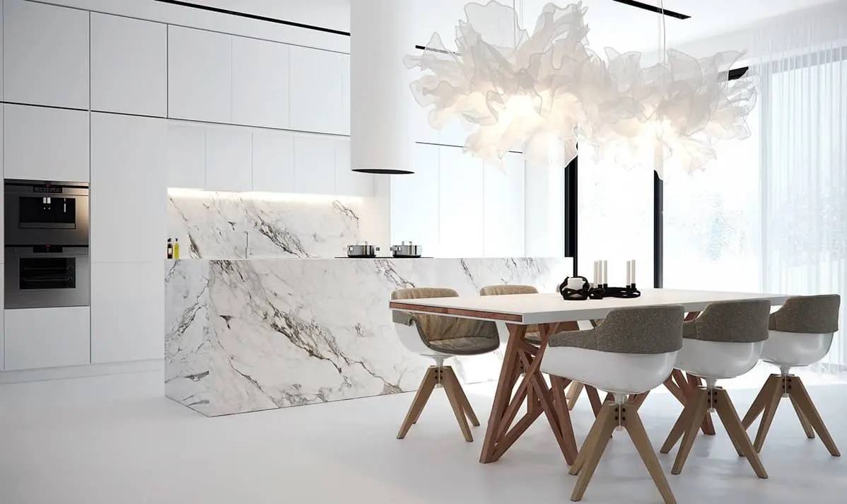 Si tienes espacio y tu cocina es de diseño, puedes elegir incluso tener una mesa de comedor integrada tal y como te proponemos en la siguiente foto. Un bloque macizo de mármol , muy elegante y dominante en todo el entorno. El resto, por supuesto, solo puede ser extremadamente mínimo y sobrio. Nada debe entorpecer la mirada que converge directamente hacia la mesa que separa la zona de la cocina del comedor. En este caso, el espacio permite la adición de una mesa de comedor tradicional.