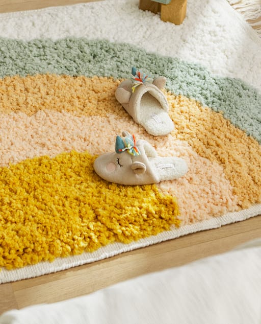 O podemos decantarnos también la alfombra infantil arcoiris de efecto pelo, la alfombra que tiene dibujos geométricos o la que cuenta con un diseño mucho más clásico con flecos y con un color neutro que seguro que os va a encantar.