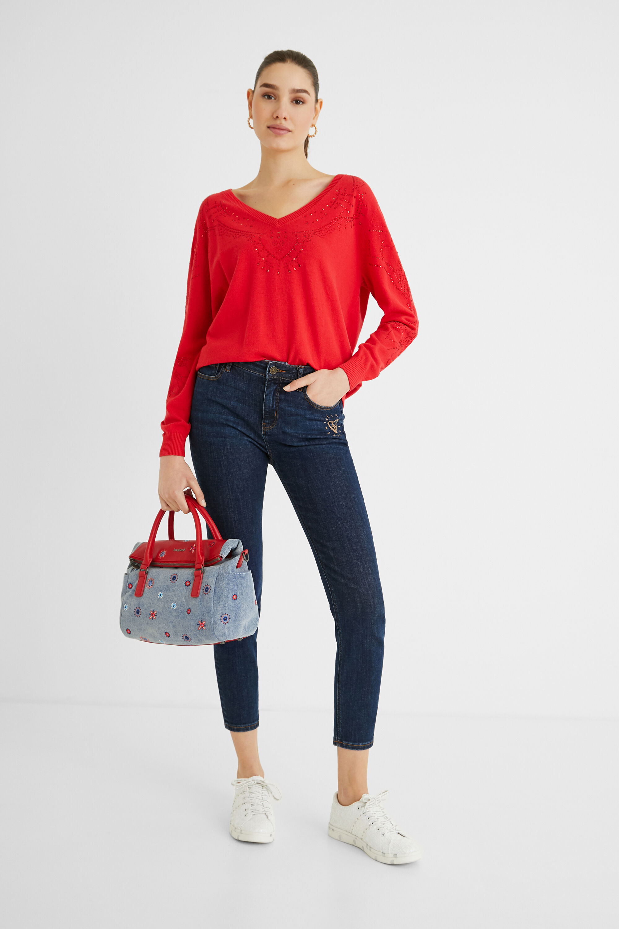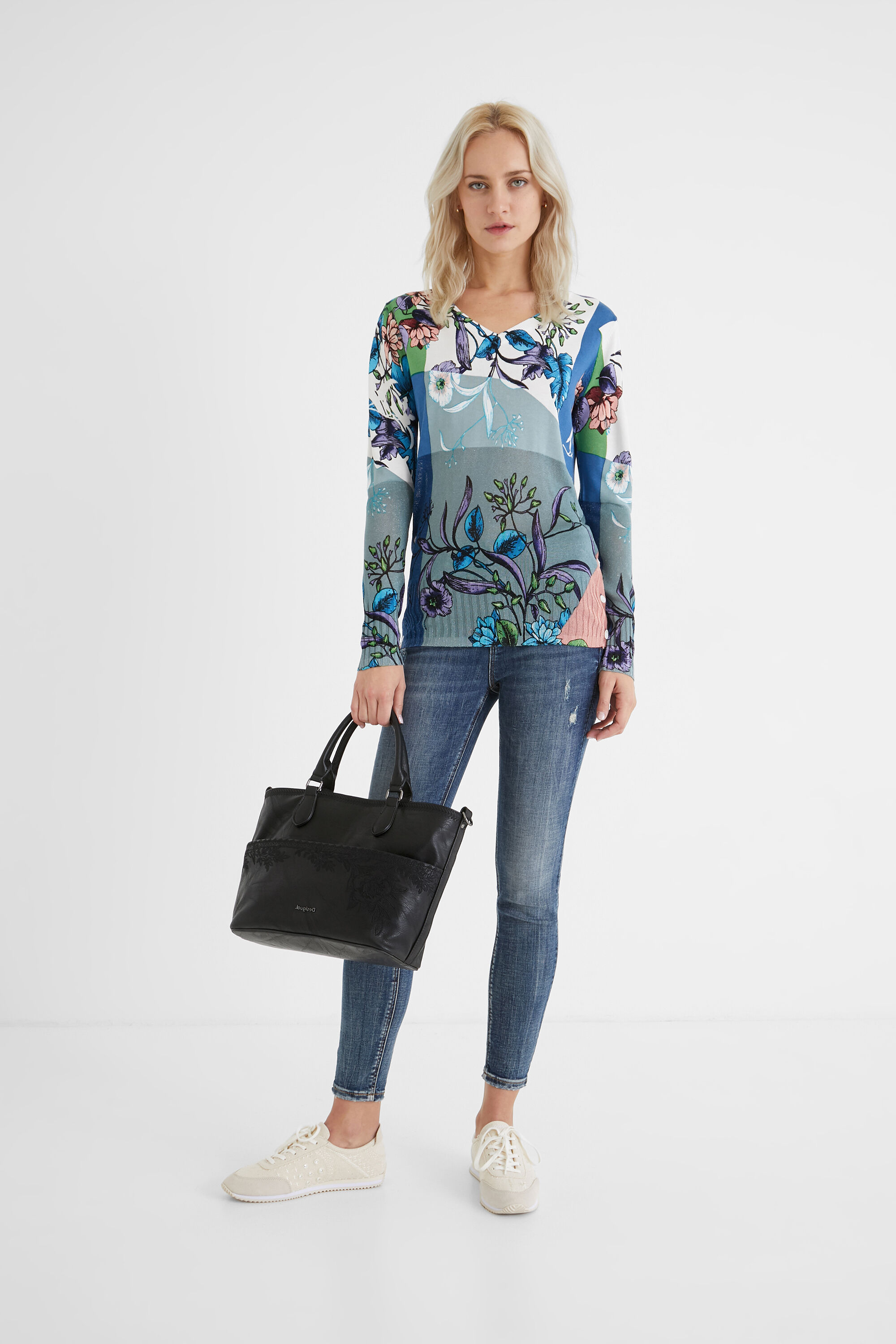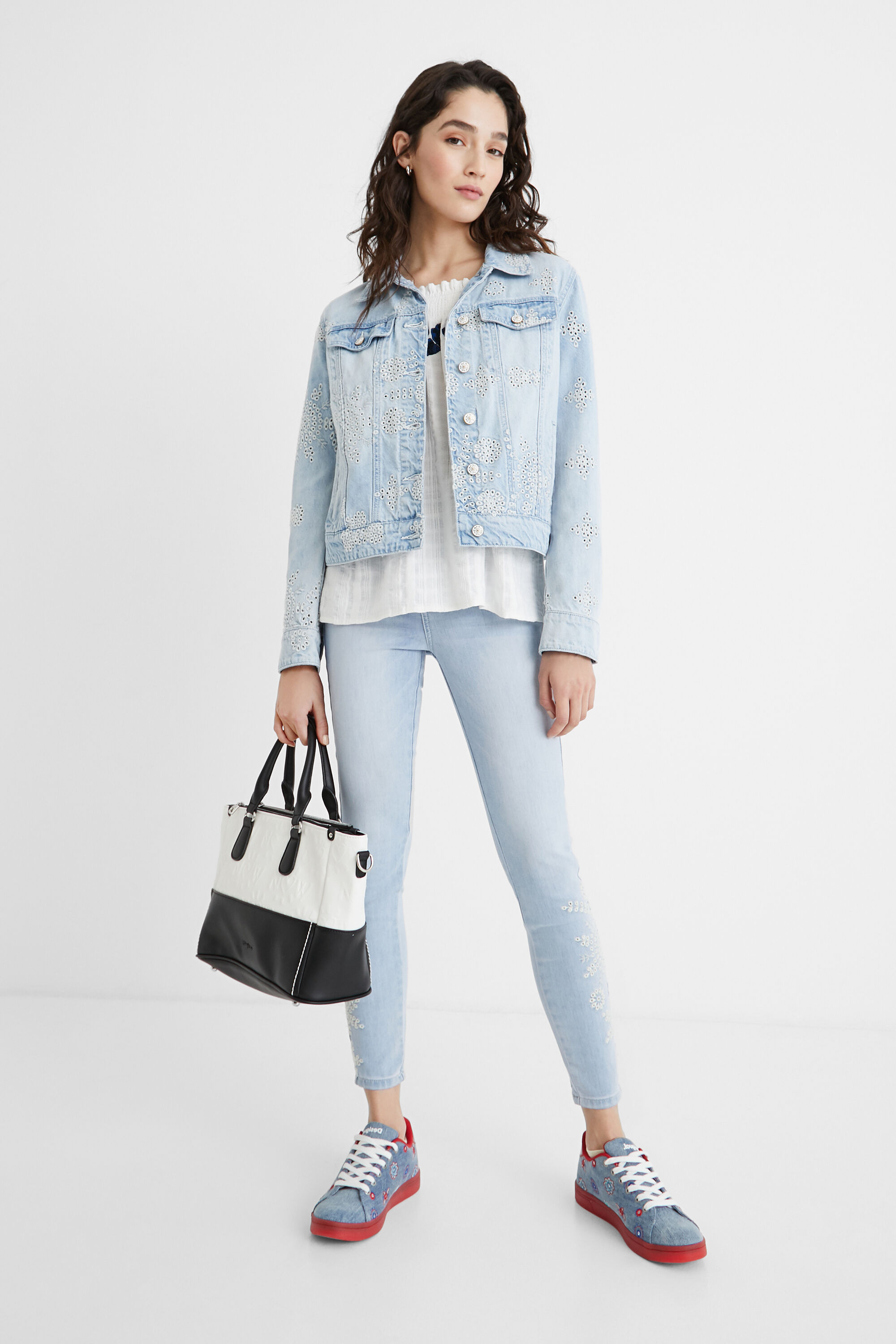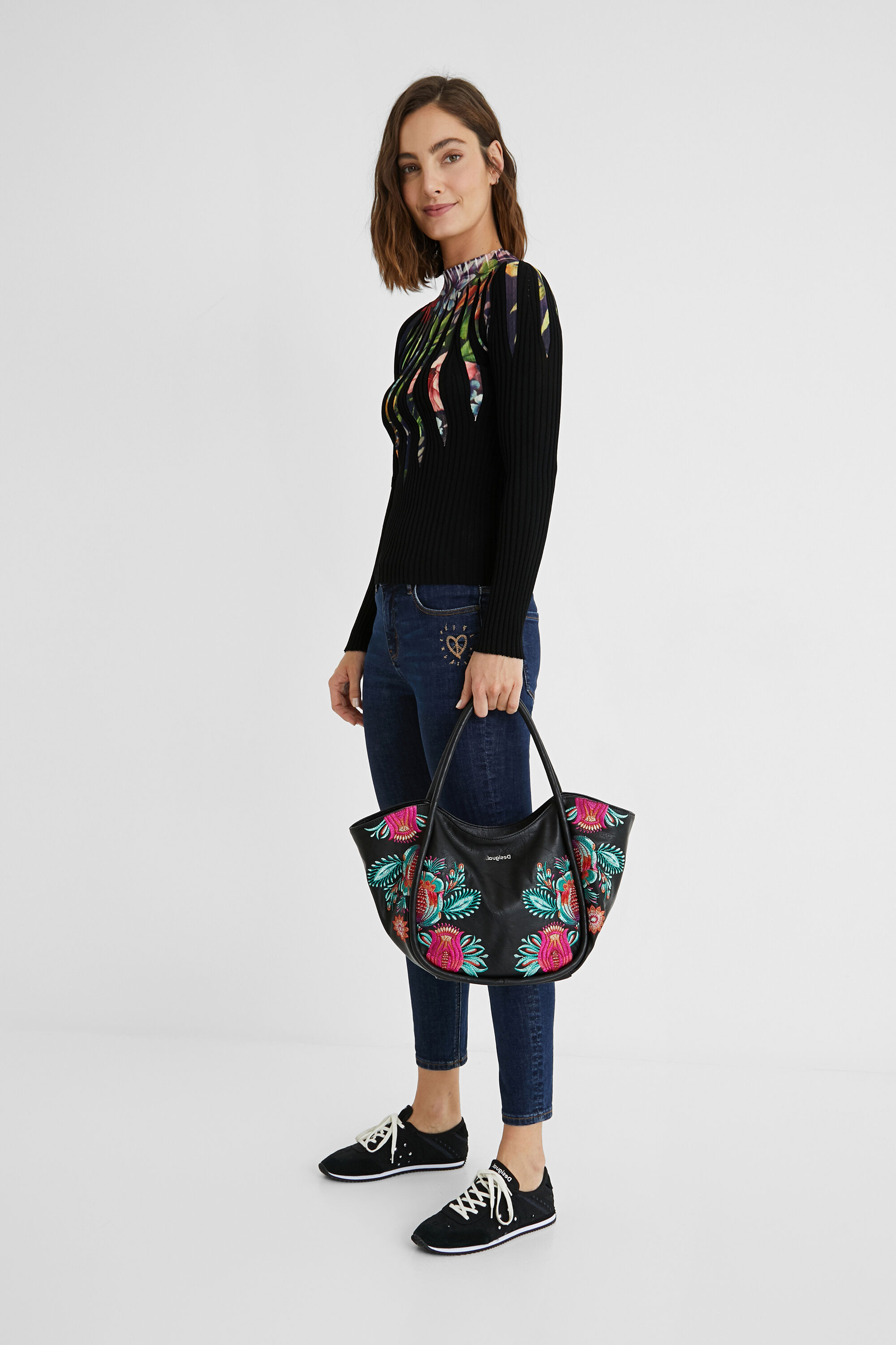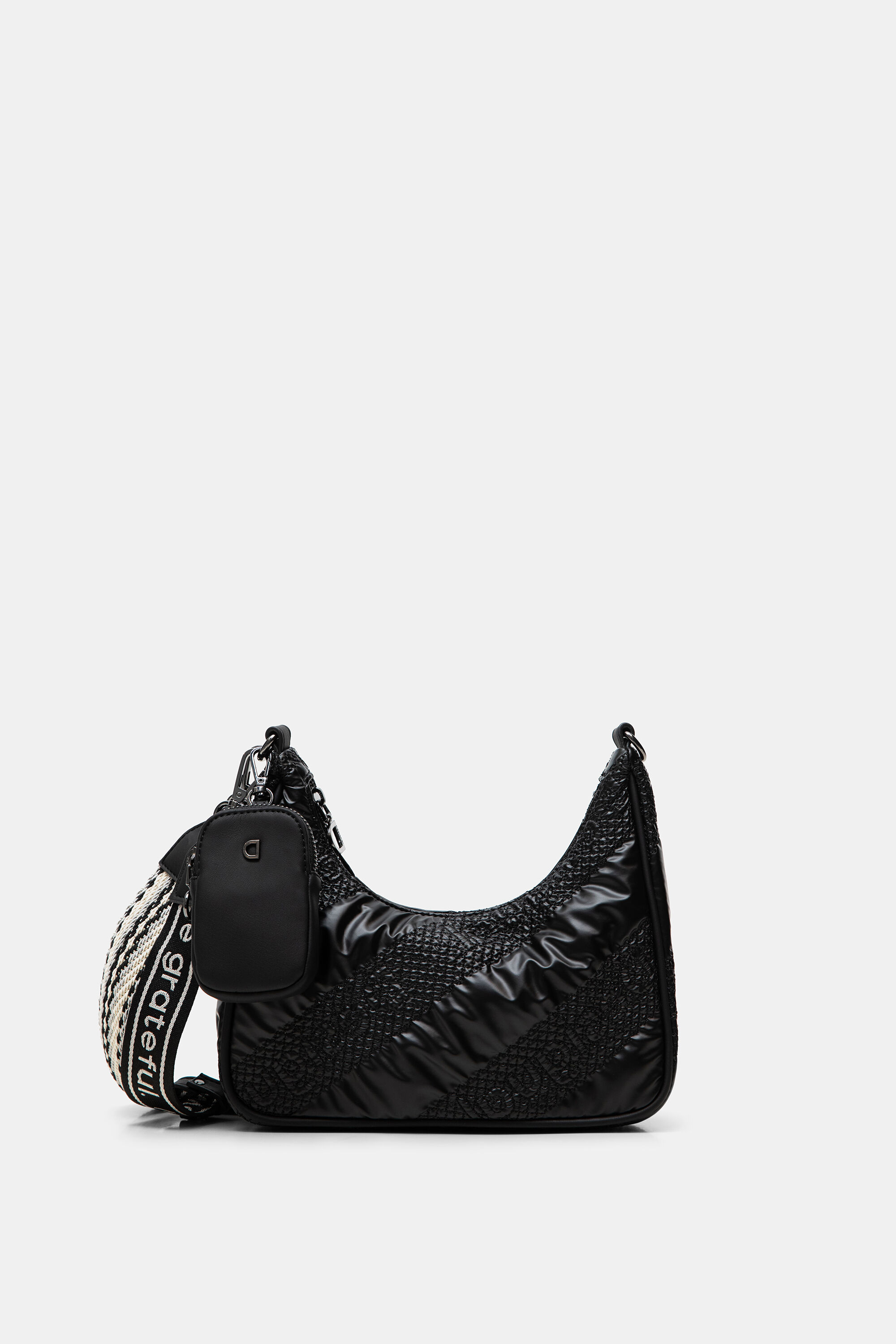 Para los que estéis modelos que sean algo más pequeños, el catálogo de bolsos Desigual de cuenta también con algunos de los mejores bolsos de mano. Podéis ver por ejemplo el modelo en color negro, el que se presenta en color blanco y negro o el bolso de mano en algodón bordado.