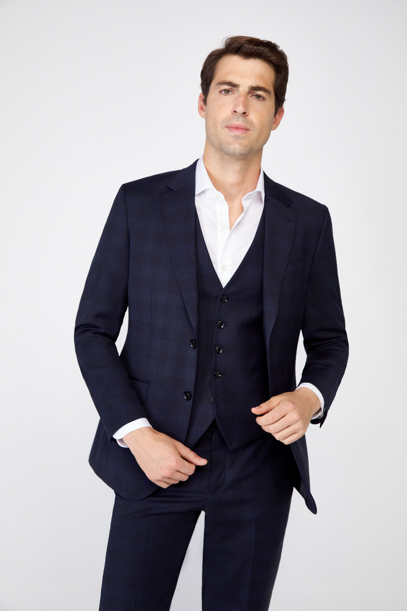 No nos olvidamos de los trajes que también están presentes dentro del catálogo de Cortefiel para hombre Otoño Inviernocon modelos de colores y diseño muy elegantes, tal y como es el traje slim fit en color gris y tejido «eco-friendly», el traje de cuadros con diseño tres piezas o el traje ojo perdiz con diseño «classic fit».