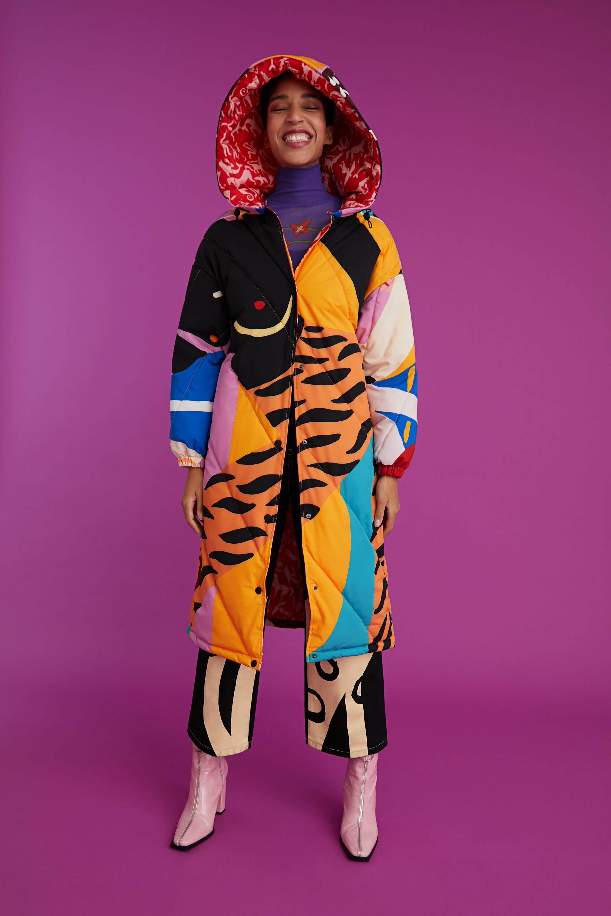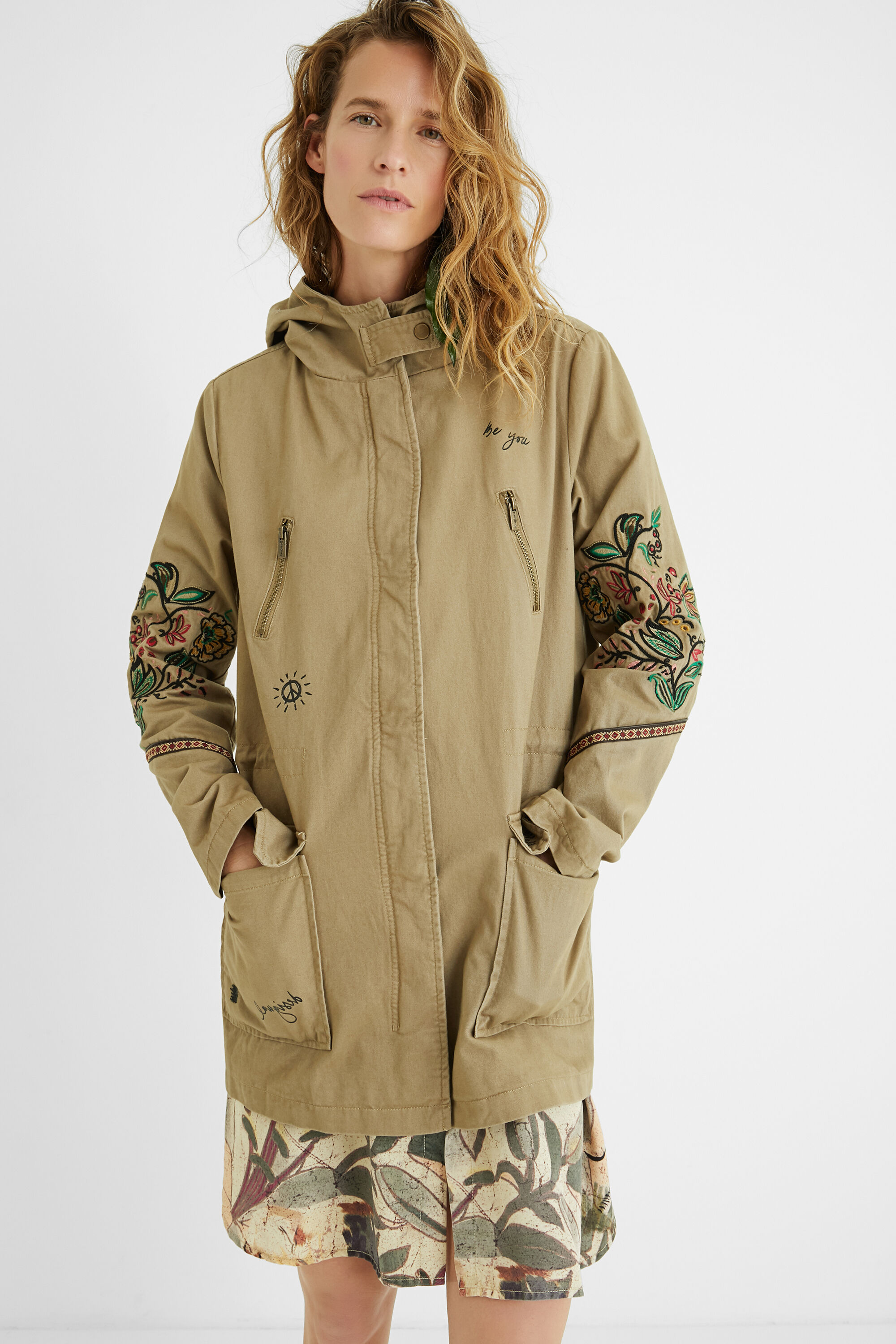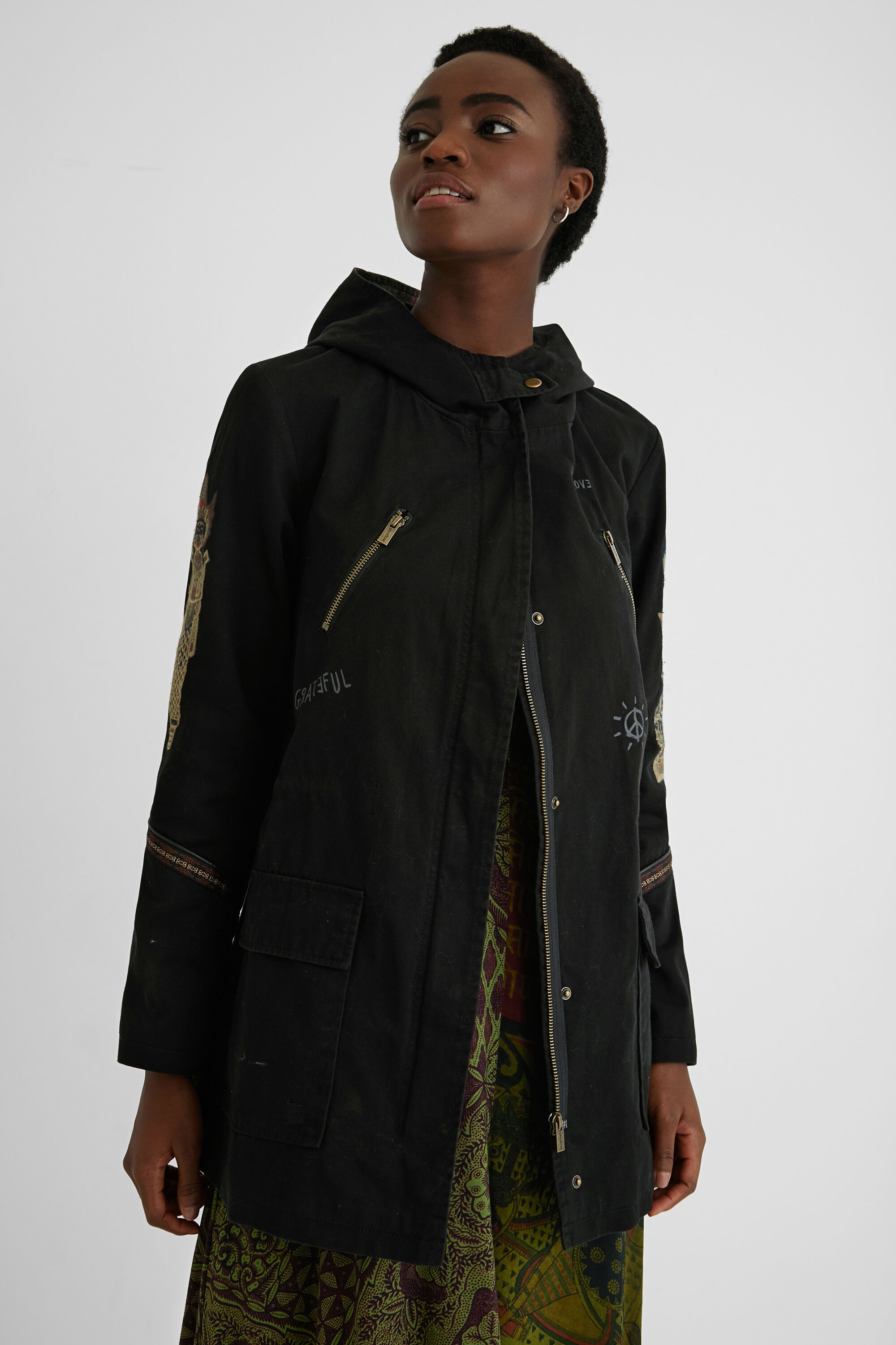 Abrigos como la parka con estampado floral o la de parches en color negro que veis arriba, pero también la parka con bordados en azul o el abrigo acolchado estampado que veis a continuación.