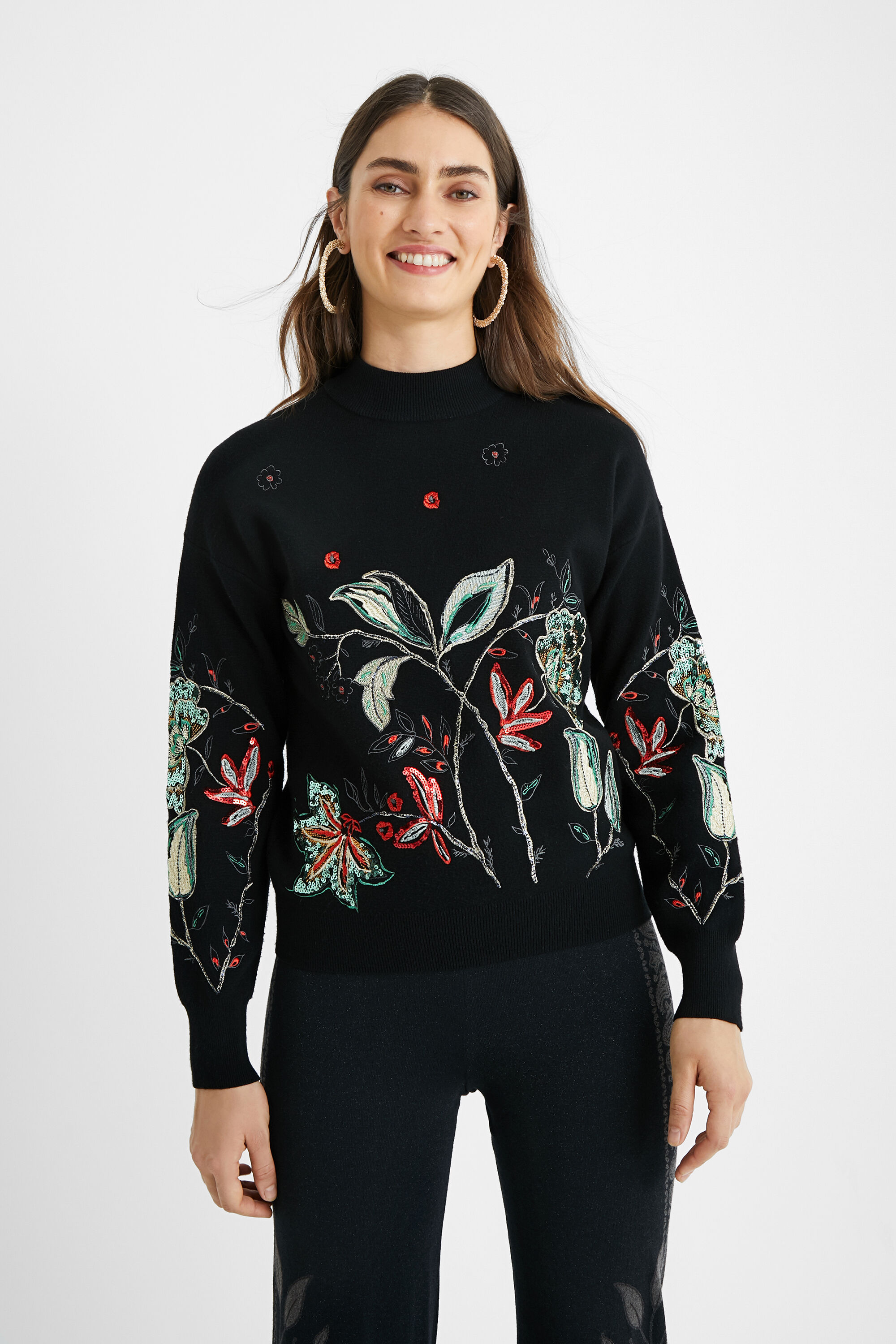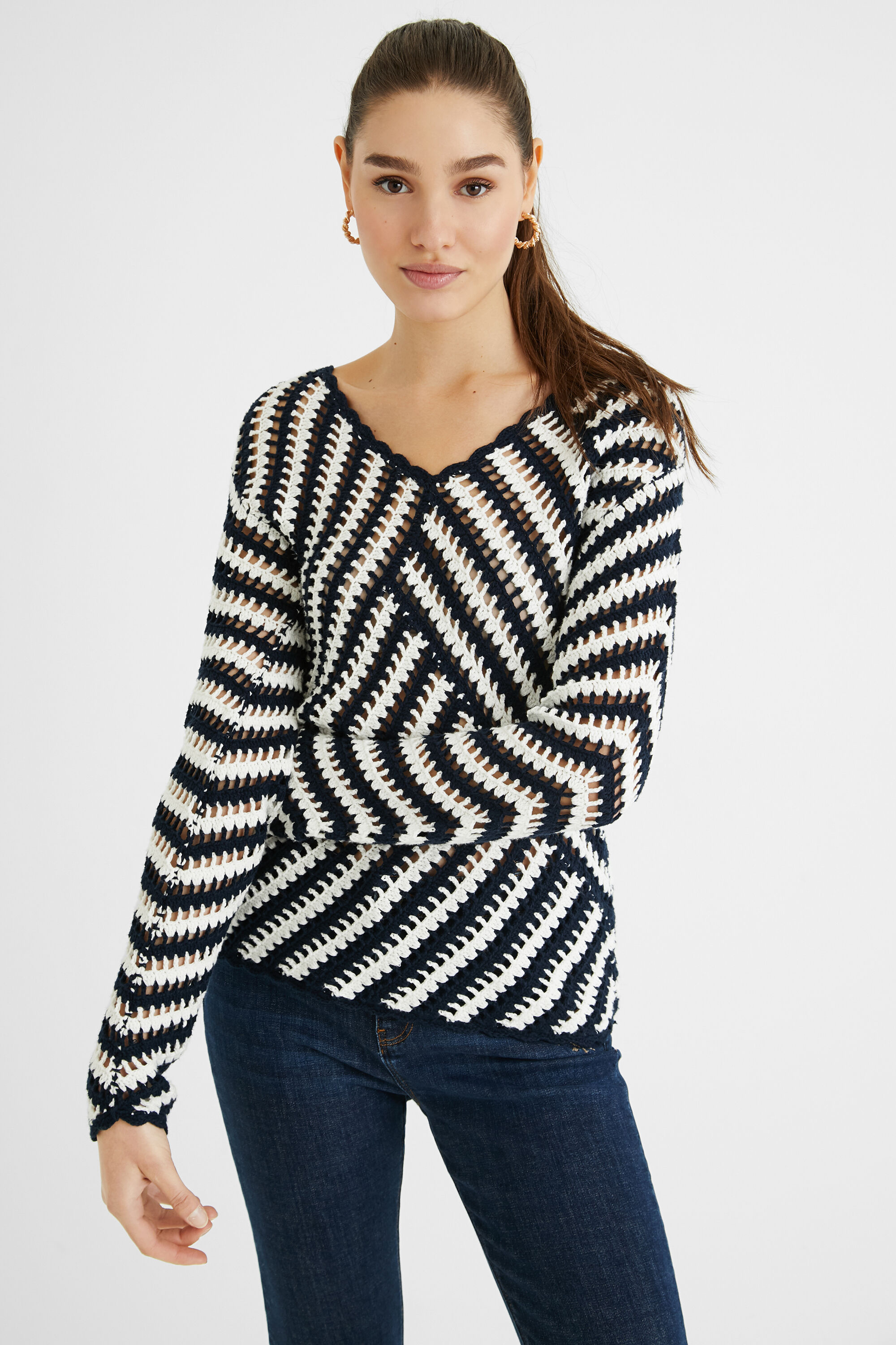 Los jerséis y sudaderas están también presentes dentro del nuevo Catálogo Desigual para mujer Otoño Invierno con modelos que marcan tendencia. Es el caso del jersey del tipo croché en blanco y negro, el jersey de punto fino bordado o el jersey largo de 100% algodón.