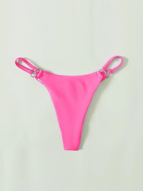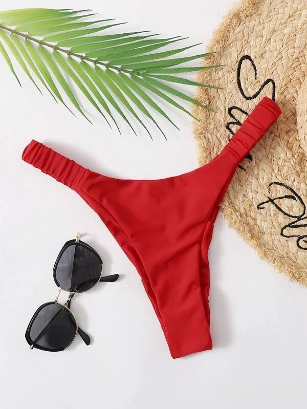 Hablamos ahora de las partes de abajo o de las braguitas dentro del catálogo Shein bikinis primavera verano, con modelos variados entre las que de alguna manera, se imponen la braguitas que son de corte alto y en colores como el rojo o el color neutro o crudo.