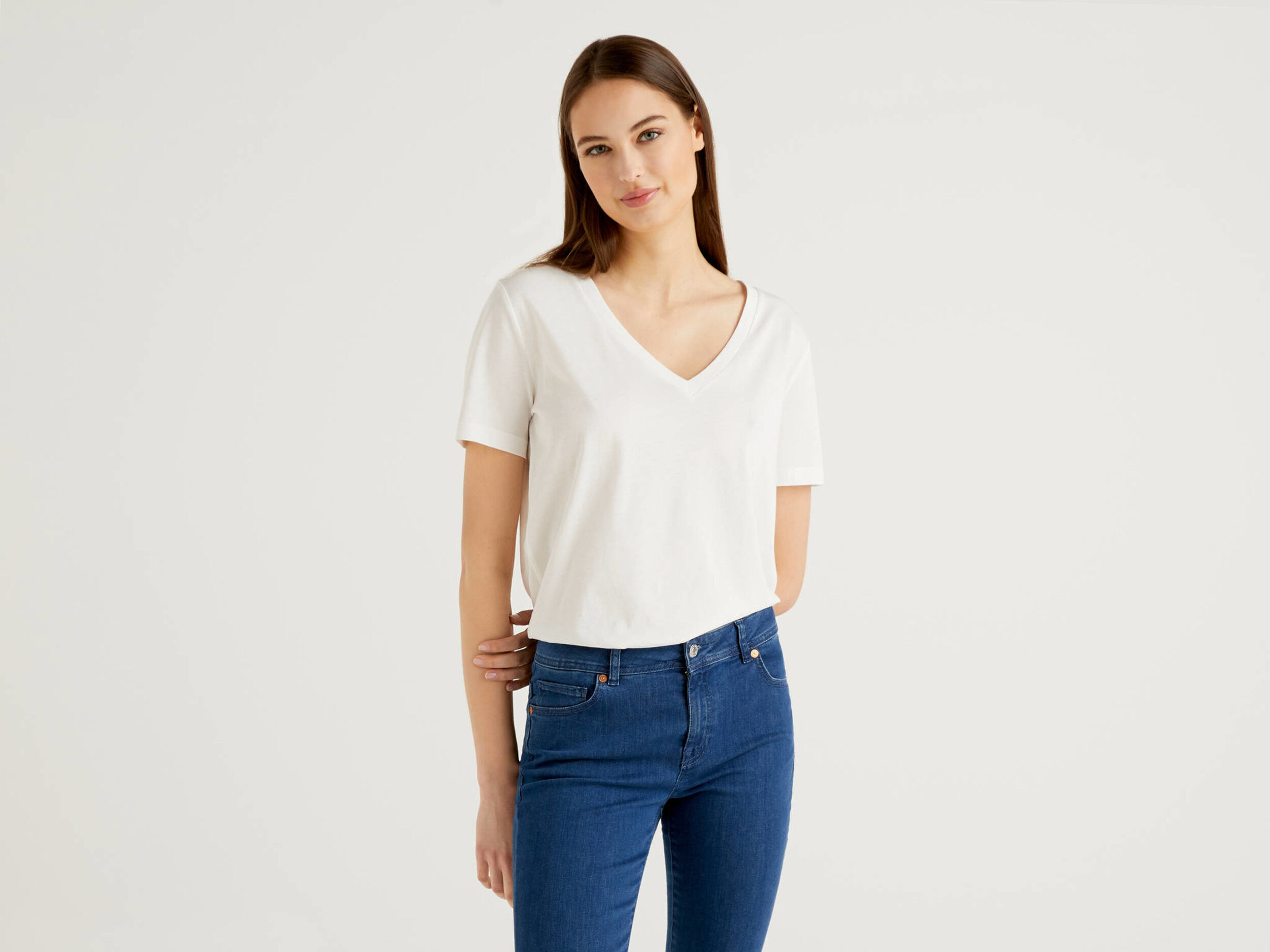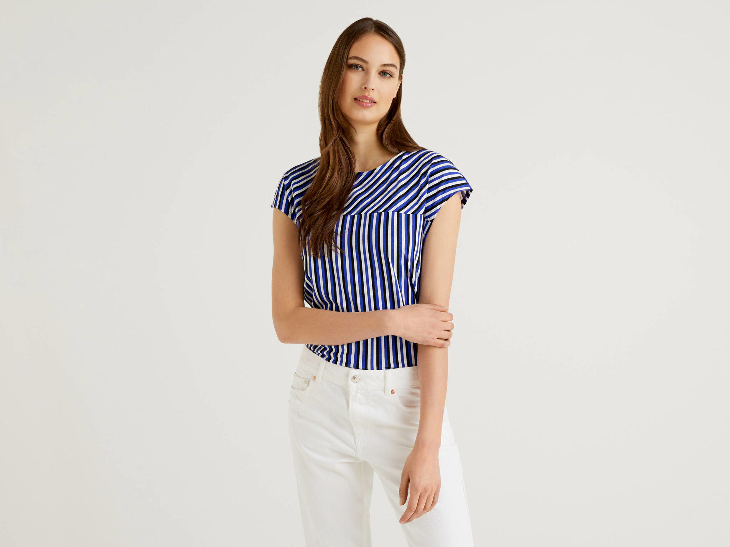 Las camisetas y tops son también prendas esenciales de mujer dentro del catálogo de Benetton para esta temporada de verano, con diseños esenciales como las camisetas de rayas, las de colores de moda como el azul o las camisetas de cuello redondo o de cuello de pico.