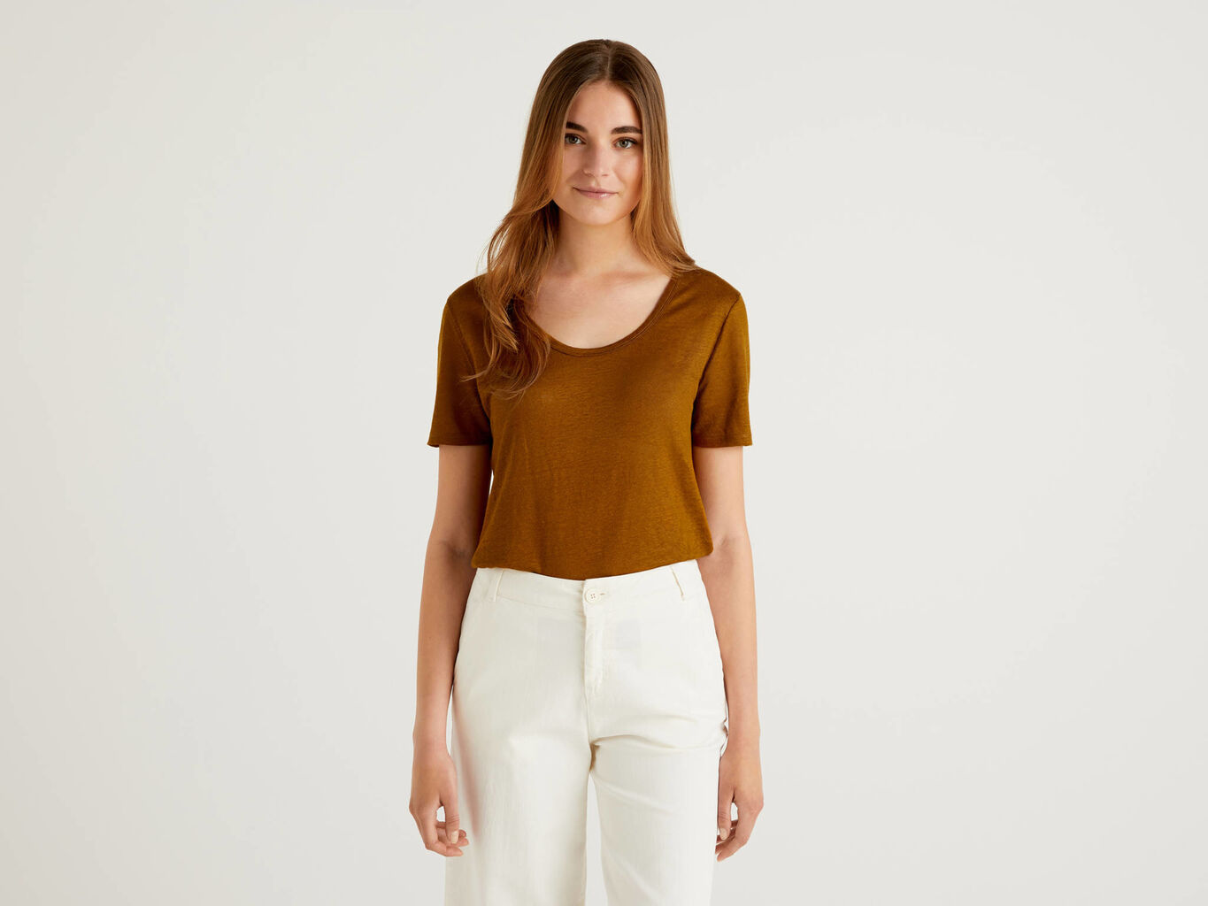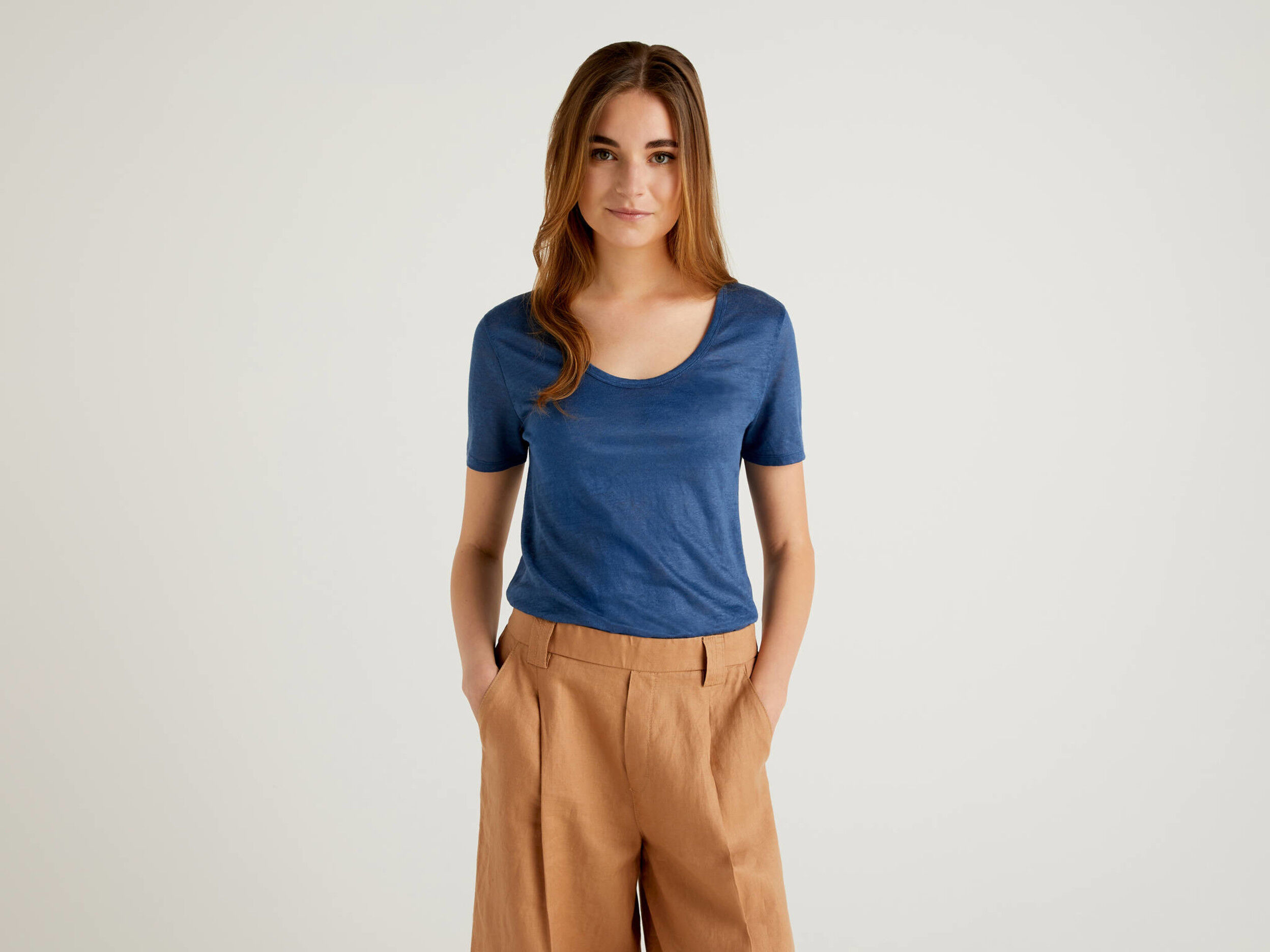Las camisetas y tops son también prendas esenciales de mujer dentro del catálogo de Benetton para esta temporada de verano, con diseños esenciales como las camisetas de rayas, las de colores de moda como el azul o las camisetas de cuello redondo o de cuello de pico.