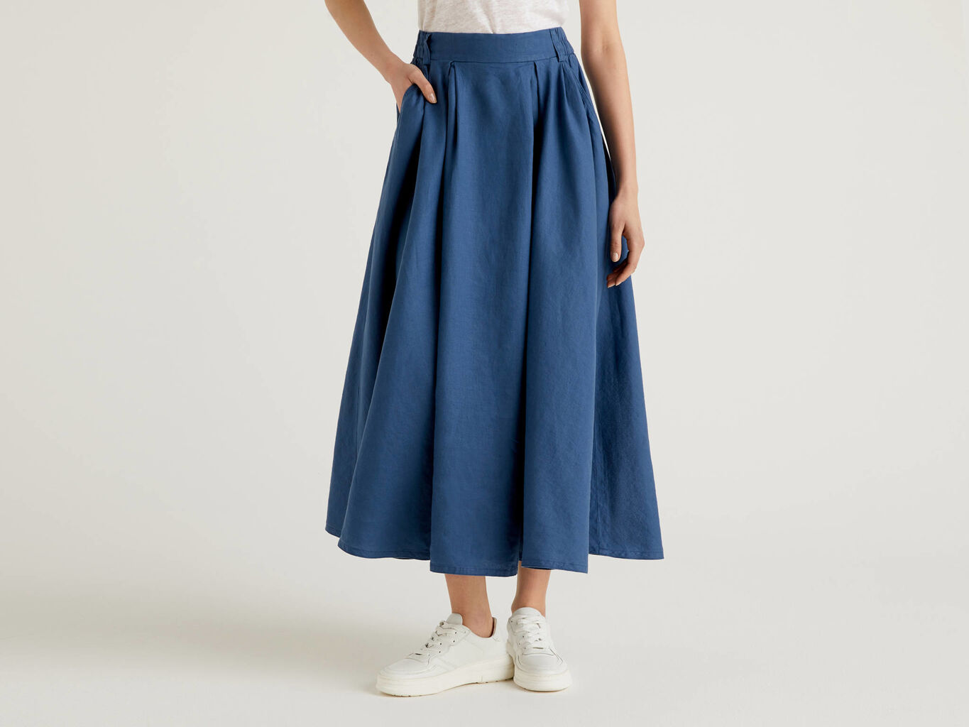 No nos olvidemos tampoco de las faldas, muy presentes entre lo nuevo de United Colors of Benetto para este verano, con modelos como la falda larga de lino en color azul.
