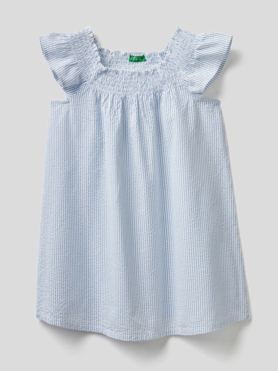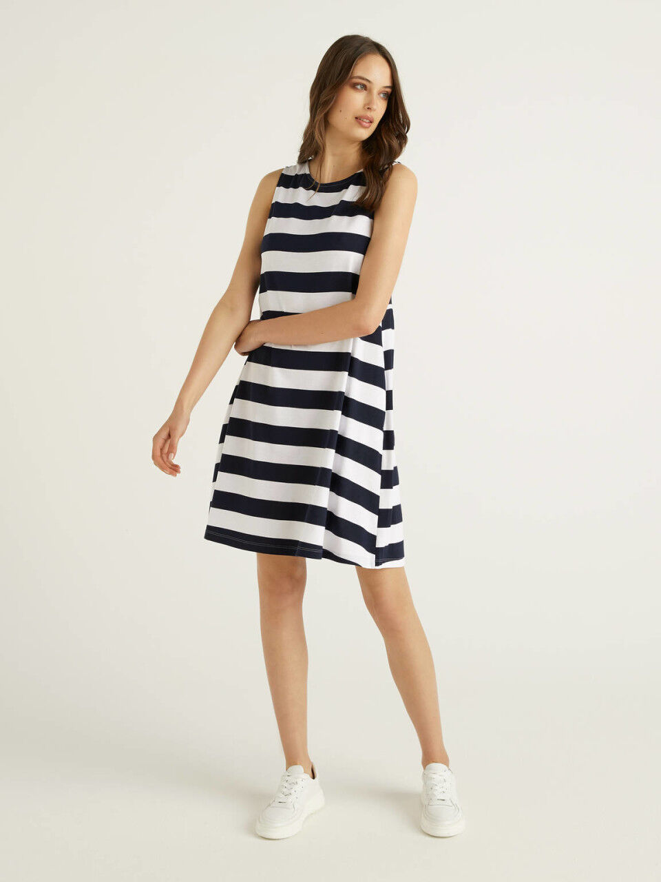 En cuanto al catálogo de mujer de United Colors of Benetton para mujer verano tenemos también una amplia variedad de propuestas entre las que destacan los vestidos cortos y midi con colores suaves o estampados de moda como el de rayas.