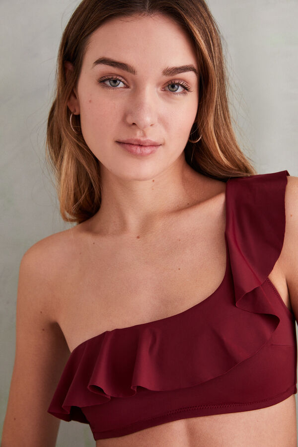 Dentro del catálogo de bikinis Women Secret de primavera verano, podemos encontrar también las braguitas de diseño media braga, en colores como el rojo y detalles además como los volantes.