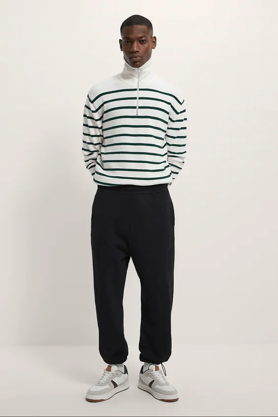 Jerséis y sudaderas son también protagonistas dentro del Catálogo ZARA para hombre Otoño Invierno, con modelos que resultan variados, pero a la vez, se trata de modelos esenciales. Nos estamos refiriendo como no a los jerséis de cuello vuelto, que se presentan en color negro, gris o lila, pero también los jerséis que cuentan con estampados como el de rayas.