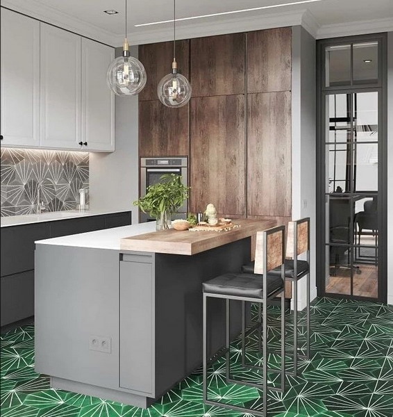 El entorno en el que se preparan los alimentos suele ser muy habitado y se ensucia fácilmente; por ello es fundamental tener en cuenta materiales adecuados, fáciles de limpiar y estéticamente bonitos. Las tendencias de los suelos de cocina moderna de ponen en primer plano el gres porcelánico, muy popular este año. Poco poroso y de fácil mantenimiento, algunas empresas lo ofrecen con un tratamiento antibacteriano. También nos encantan los mosaicos y las baldosas de madera recuperada.