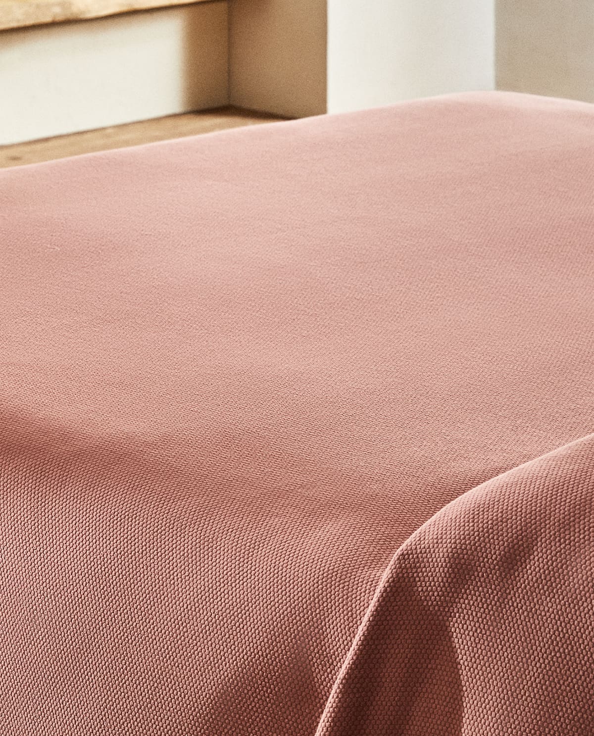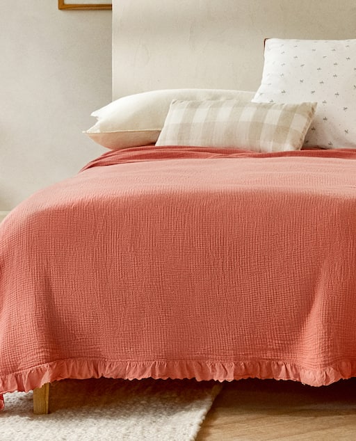 Para las colchas con algo más de color, Zara Home se decanta por modelos como la colcha azul antes mencionada, o esta que vemos a continuación en color rosa, que si bien la firma define como «panel de abeja» está hecha con algodón.