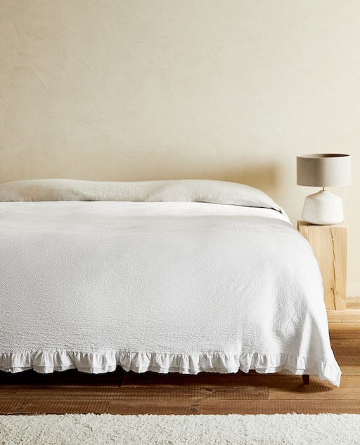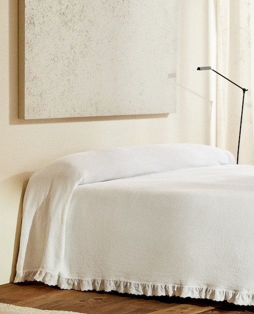 El blanco es también un color de moda para las colchas por mucho que se trate de las de la temporada de Otoño Invierno. Así, podemos encontrarnos con modelos de Zara Home increíbles como esta colchas con bordados y volantes.