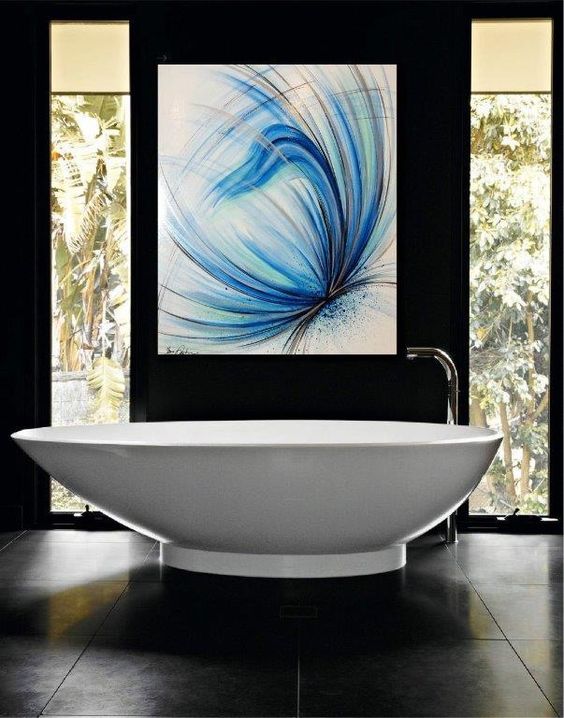 En un baño donde predomine el estilo moderno , los cuadros más adecuados son los abstractos o contemporáneos . En este caso, es mejor no colocar ningún marco, más adecuado para un estilo clásico.