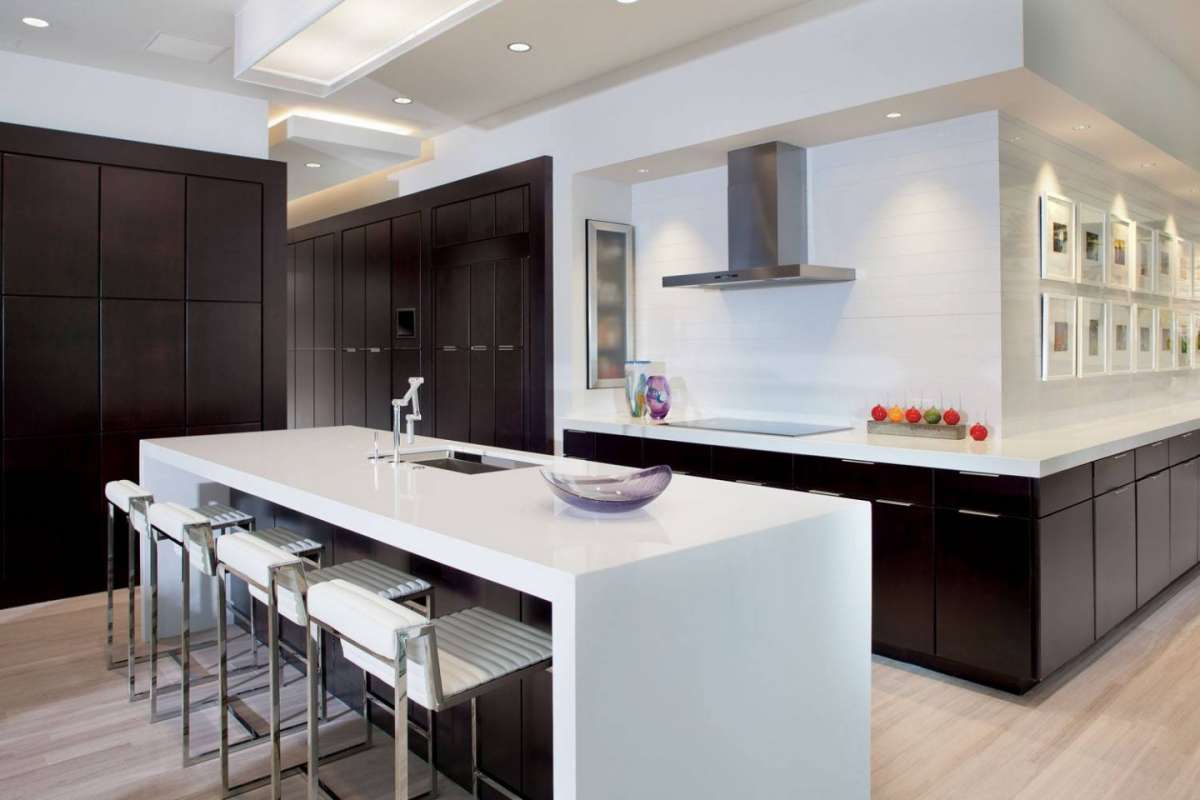 Moderna cocina americana de líneas básicas y elegantes. De nuevo la apuesta de color aquí es el marrón y el blanco.