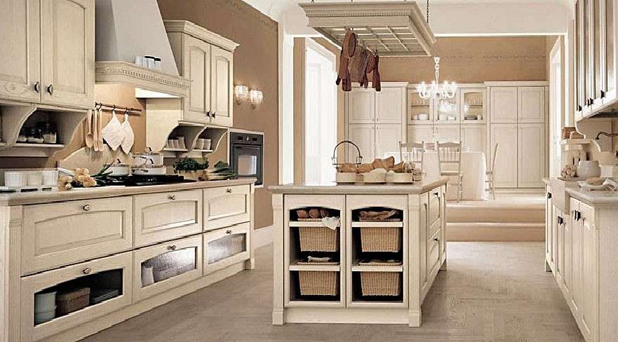 O podemos decantarnos por una cocina de aire «retro» como la que vemos arriba con muebles en madera y con muchos detalles.