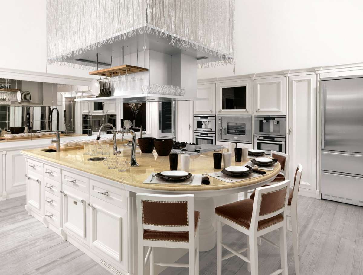 Volviendo al diseño de las cocinas americanas, las más modernas suelen tener como decimos una isla central, pero si buscas algo más clásico, nada como elegir una isla que sea más una mesa central tal  y como vemos en el modelo arriba.
