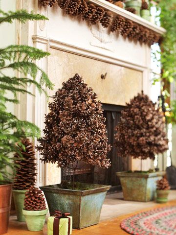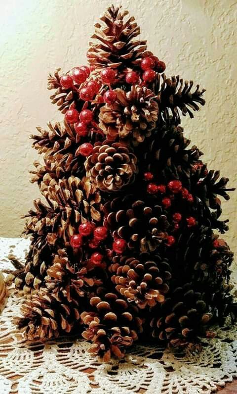 Con un sabor más tradicional, el árbol de Navidad de piñas en la siguiente foto es también ideal: para crearlo, cepilla las puntas de las piñas con un color acrílico blanco y alterna con frutos rojos artificiales o secos.