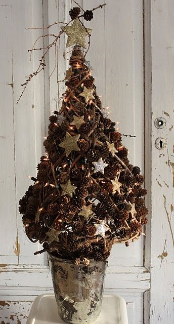En el árbol de la siguiente foto se han utilizado piñas más alargadas y se han pegado por un lado en lugar del tallo , creando, gracias a la cinta decorativa , un movimiento en espiral que conduce a la estrella en la punta.