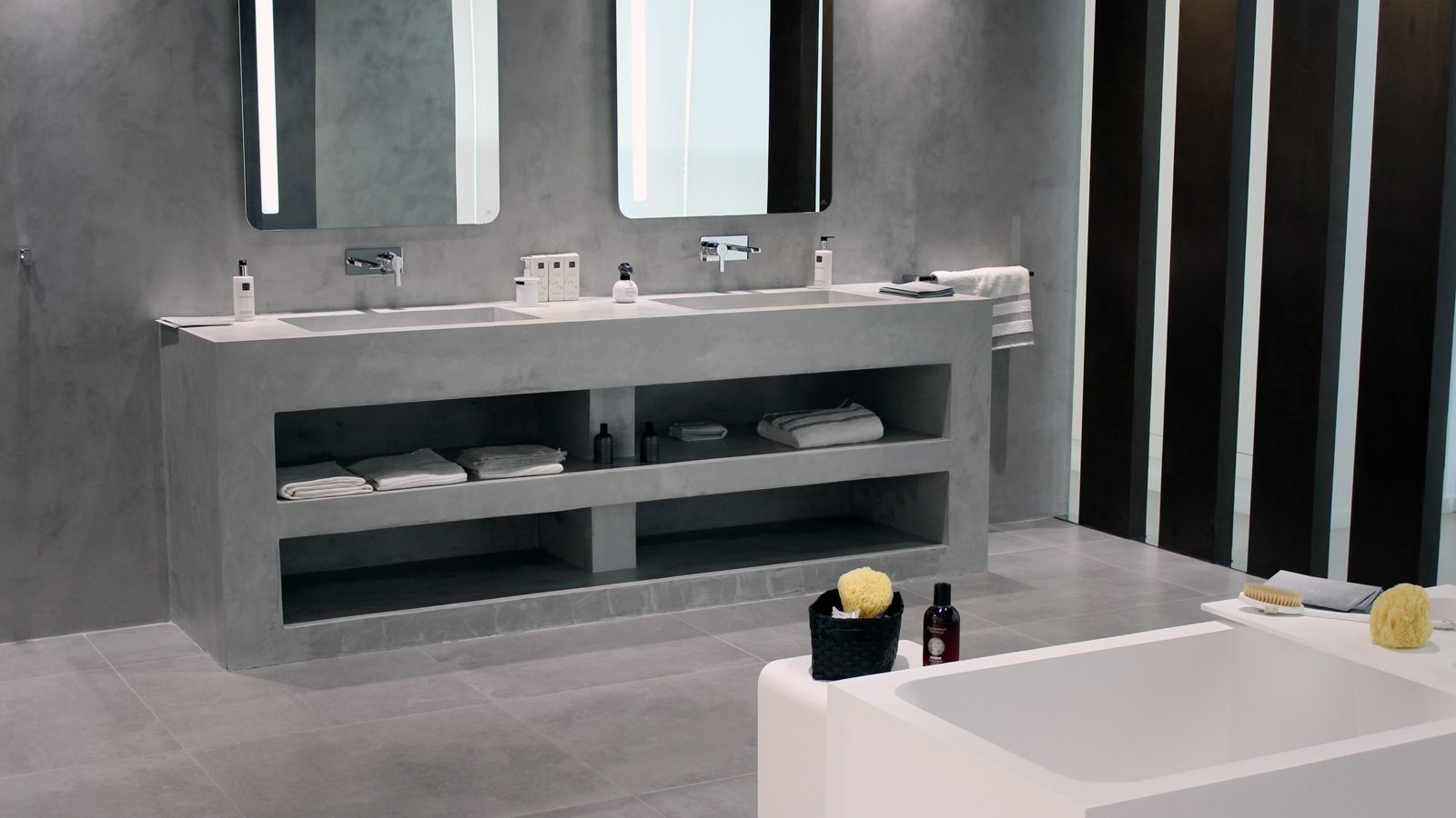 Como decimos, el microcemento es muy utilizado en el revestimiento de baños, gracias a su superficie lisa y completamente sin costuras, lo que lo hace muy simple y fácil de limpiar. Su espesor varía de uno a tres milímetros; esto da la posibilidad de cubrir incluso suelos viejos sin tener que quitar los preexistentes y sin tener que preocuparse por el transporte y eliminación del material demolido.