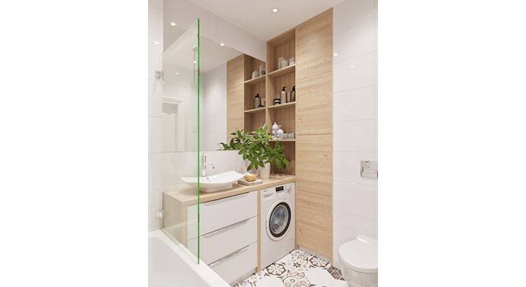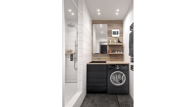 En un estudio, un apartamento pequeño, falta de espacio en otras habitaciones, muchas veces es necesario instalar la lavadora en el baño. Dispuesta bajo una encimera donde encaja el fregadero, la zona de lavado es discreta. Práctico y compacto también, la ducha italiana con dimensiones XXL, construida a medida a lo largo del baño. Los azulejos blancos, la pintura blanca también te permiten tener la sensación de todo es más amplio con un suelo de madera gris tratado contra la humedad.