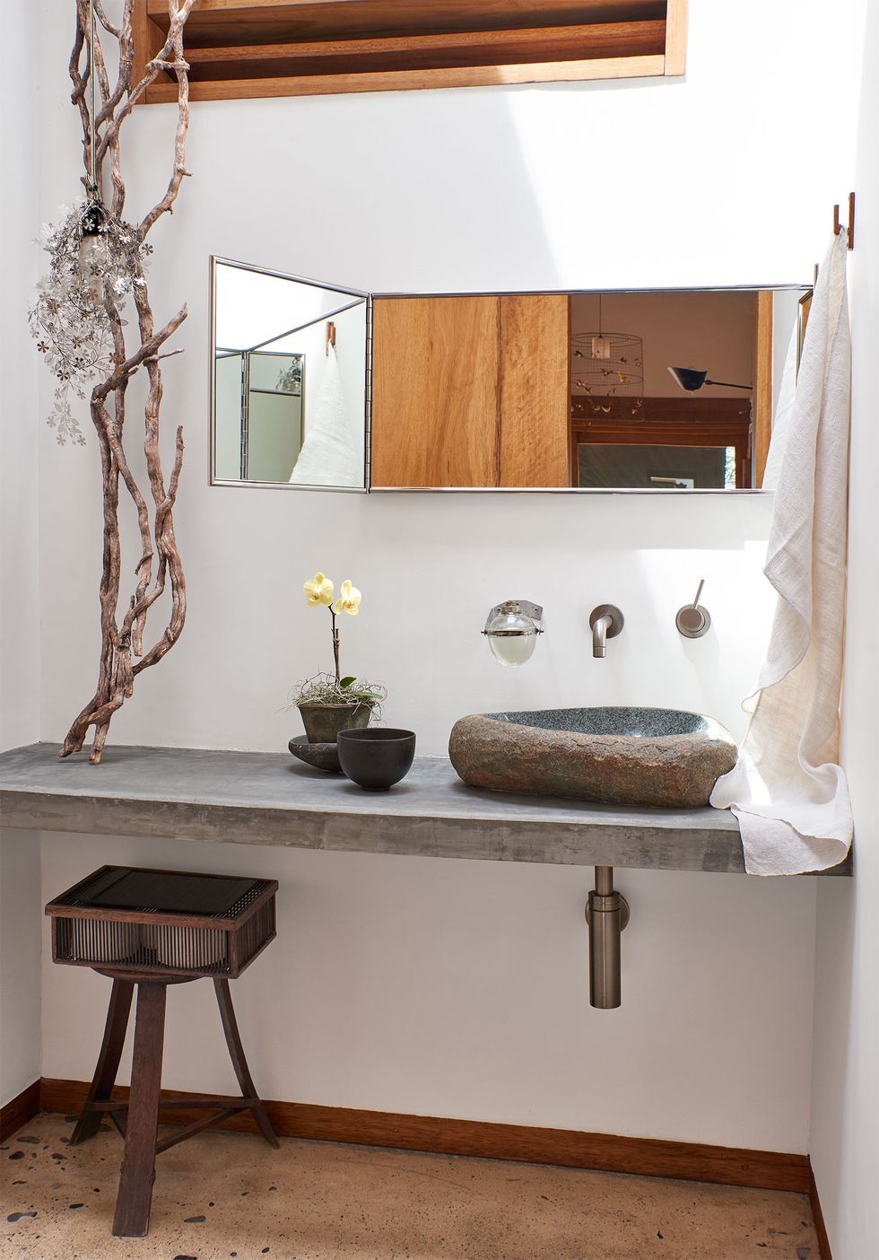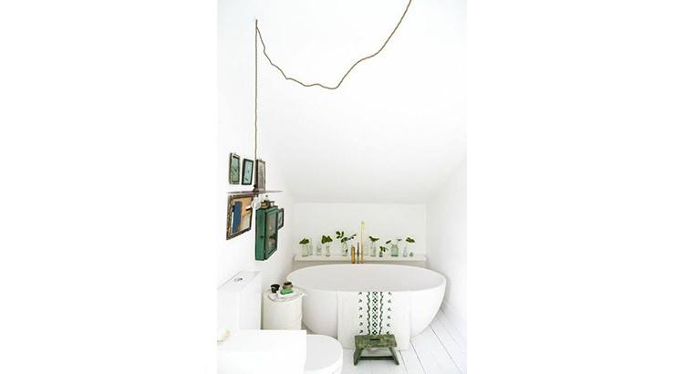 Dispuesto con una bañera exenta, este pequeño baño con suelo de baldosas de cemento es funcional y decorativo gracias a los prácticos estantes adosados a la pared.