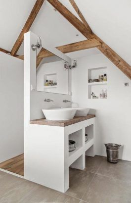 Nos encanta el efecto decorativo del gris antracita en el baño. En hormigón encerado, en pintura, con azulejos, el gris antracita encaja fácilmente en un baño pequeño para crear un espacio íntimo y decorativo. La idea es contrastarlo con un material cálido como en este mini baño donde la viga vista y el montante de la pared de cristal de la ducha italiana están protegidos por un barniz marino incoloro.