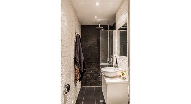 En este baño además se apuesta por una encimera de lavabo súper estrecha y pequeña.