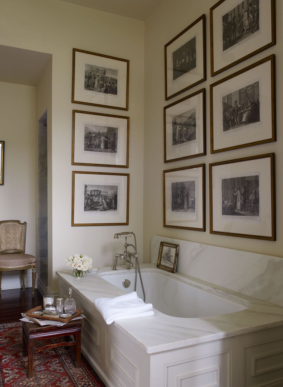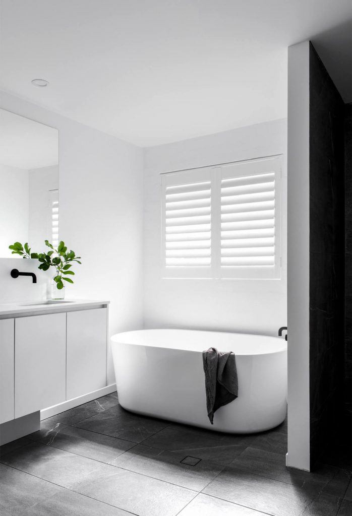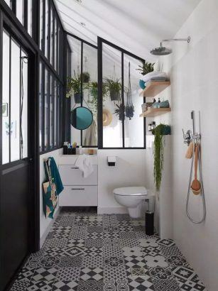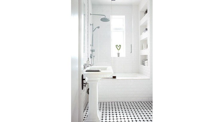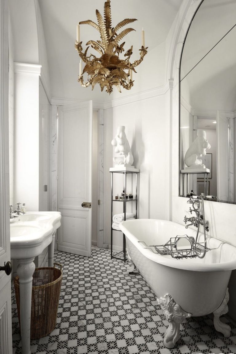 ¿Perpendicular o paralela a la pared larga? Obviamente depende del ancho del baño . O la posición de la ventana y su apertura (porque muchas veces colocarse por encima de la bañera para cerrarla no es cosa de todos). Atmósfera chic para este baño clásico y estiloso.
