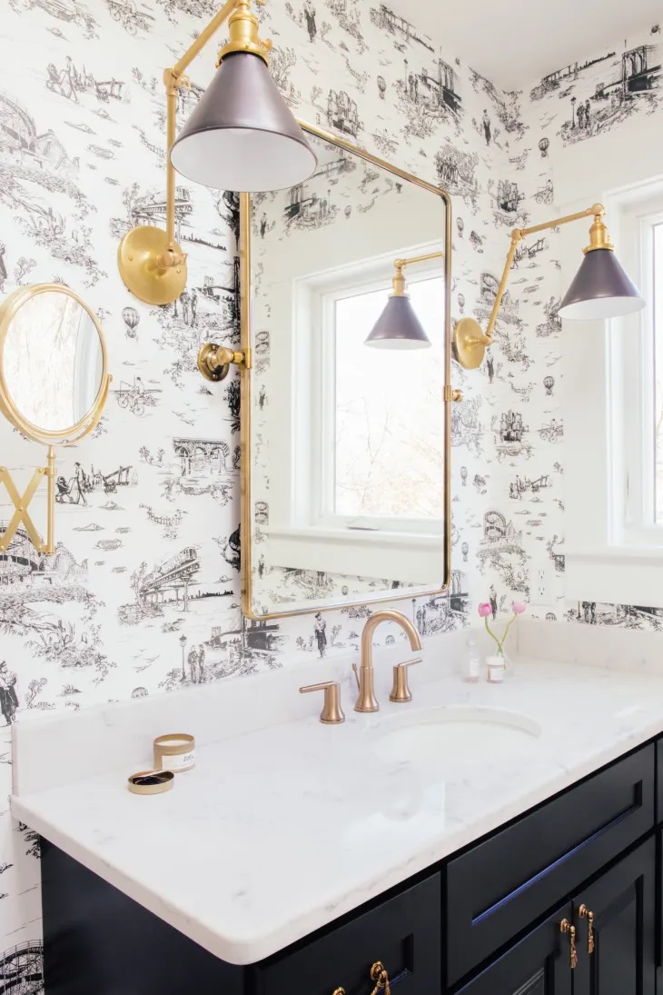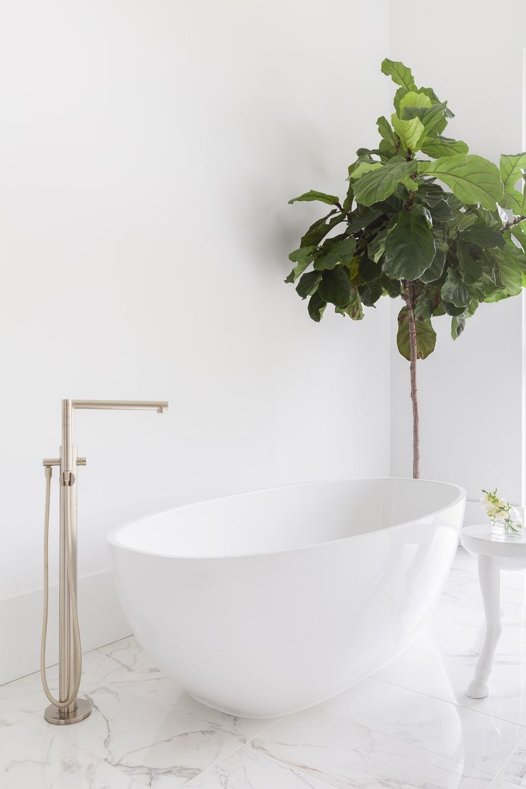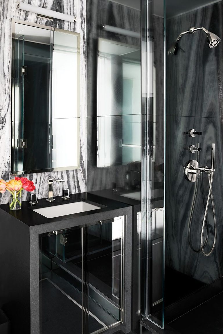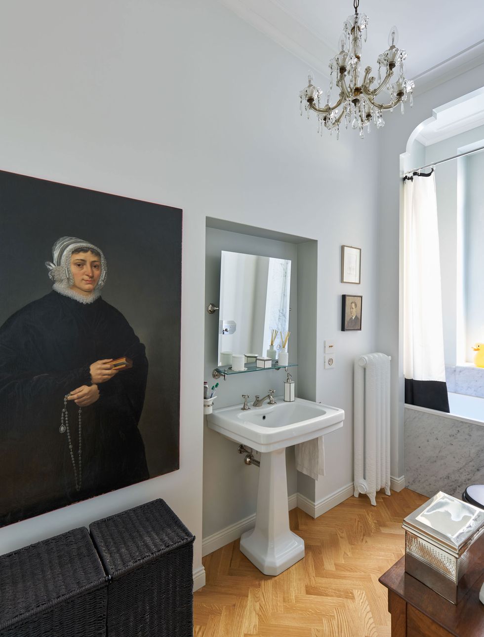 ¿Perpendicular o paralela a la pared larga? Obviamente depende del ancho del baño . O la posición de la ventana y su apertura (porque muchas veces colocarse por encima de la bañera para cerrarla no es cosa de todos). Atmósfera chic para este baño clásico y estiloso.