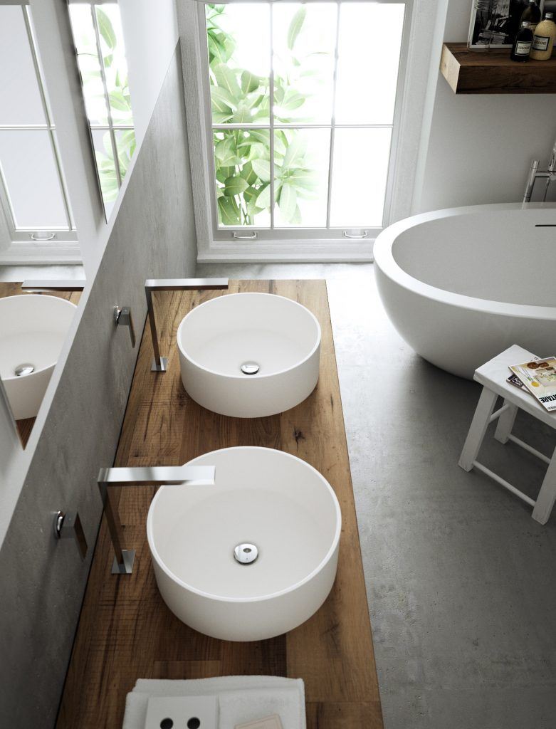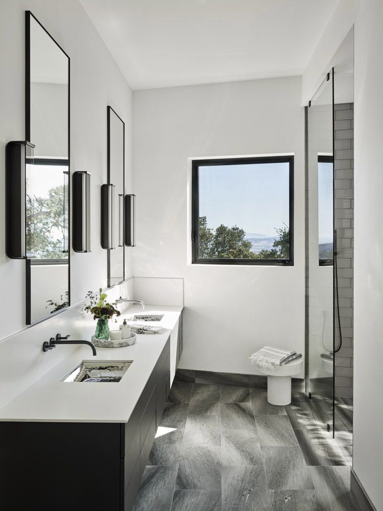 Esto es un poco menos común pero resulta del todo original. Solo es posible si la amplitud del baño claramente lo permite. Ya sea una ventana o una puerta ventana, es más cómodo si no hay nada enfrente. Por supuesto, este baño es rectangular en lugar de estrecho y largo … ¡pero podemos tomar prestada la idea!