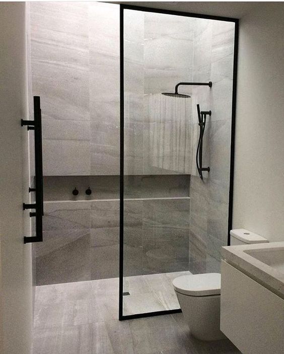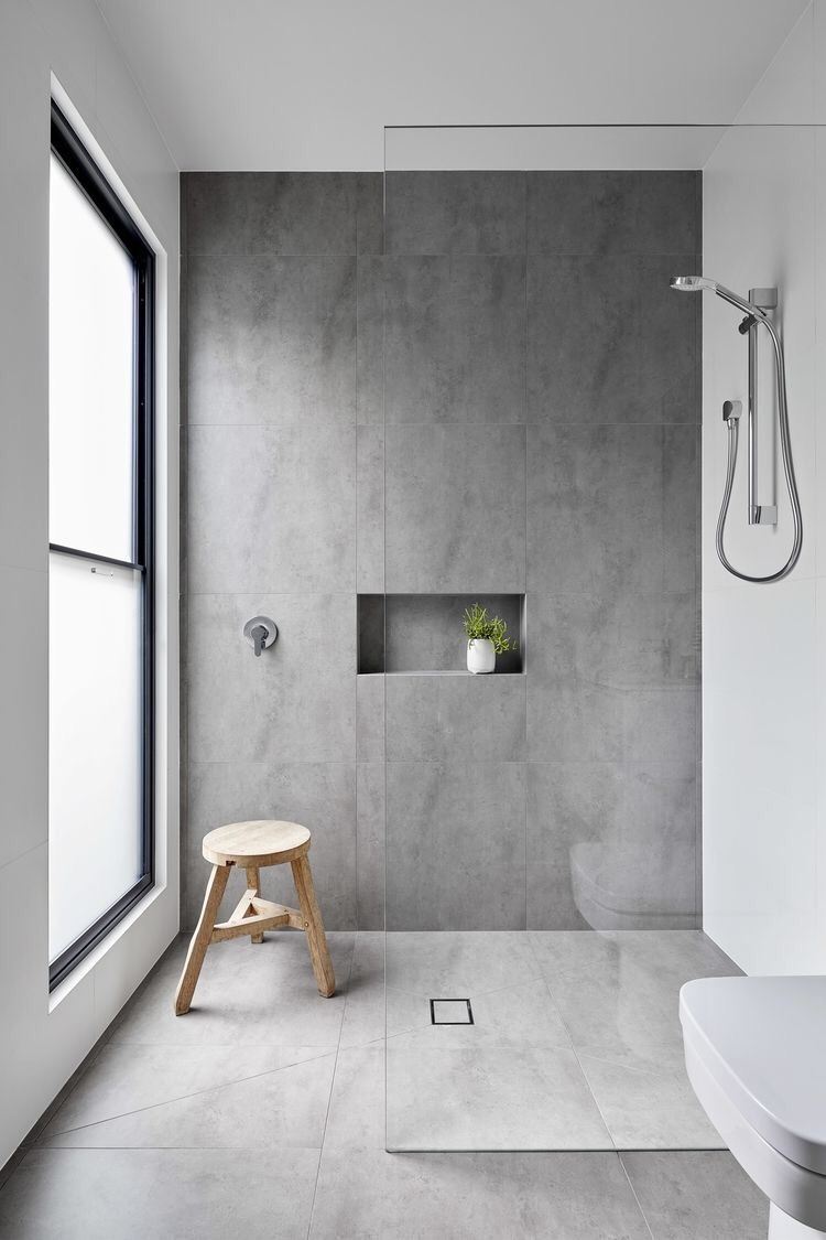 Aquí hay una unión sutil entre la madera y los azulejos de color gris claro para este pequeño y encantador baño con una ducha italiana moderna y con estilo.