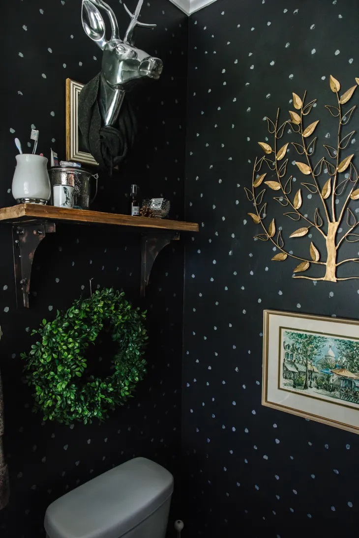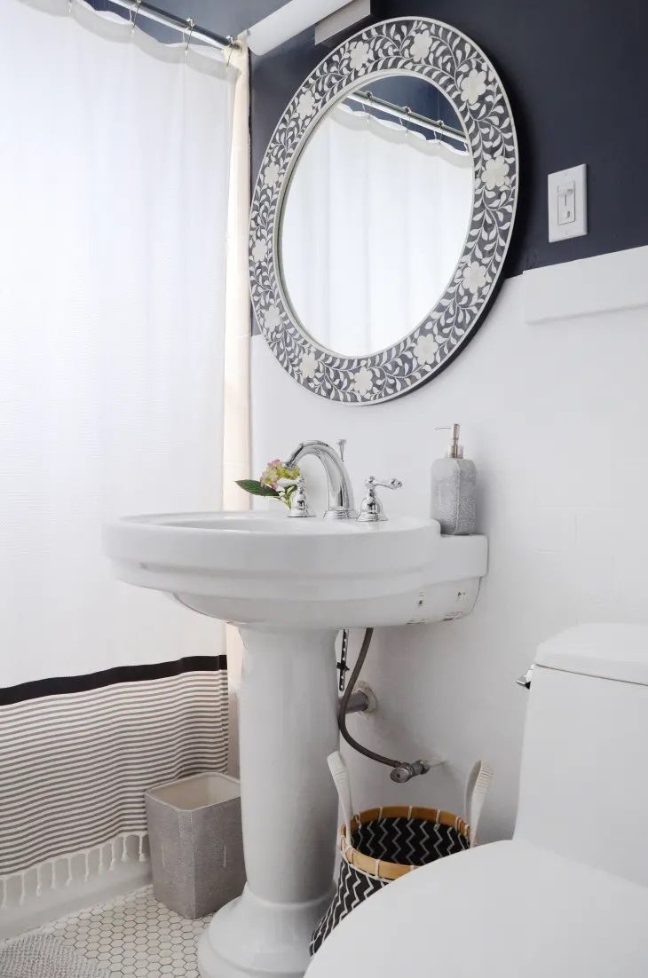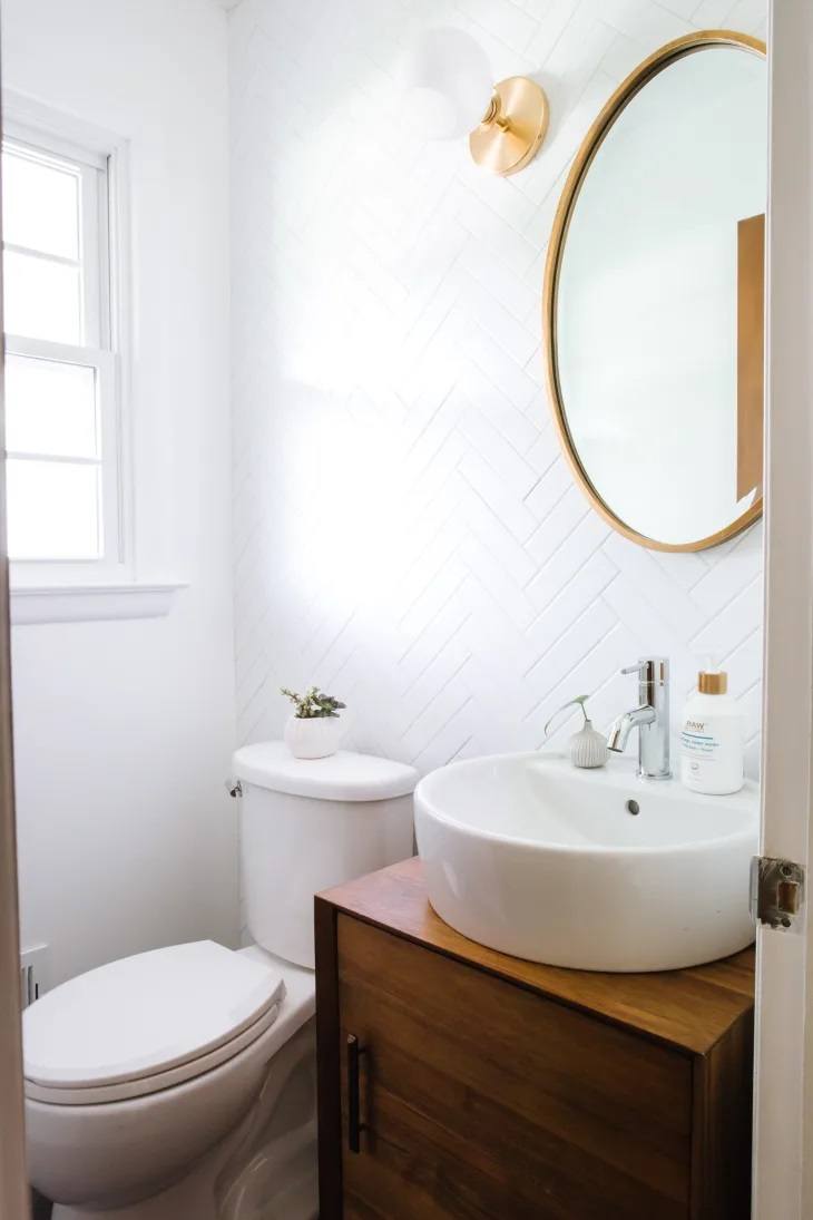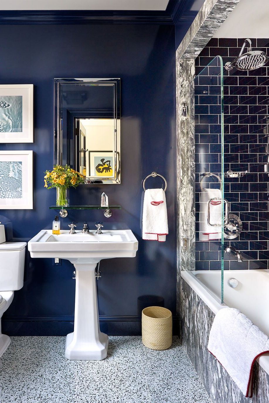 Pintar la pared trasera del baño pequeño en un color oscuro le da a la habitación una impresión de grandeza cuidadosamente acondicionada