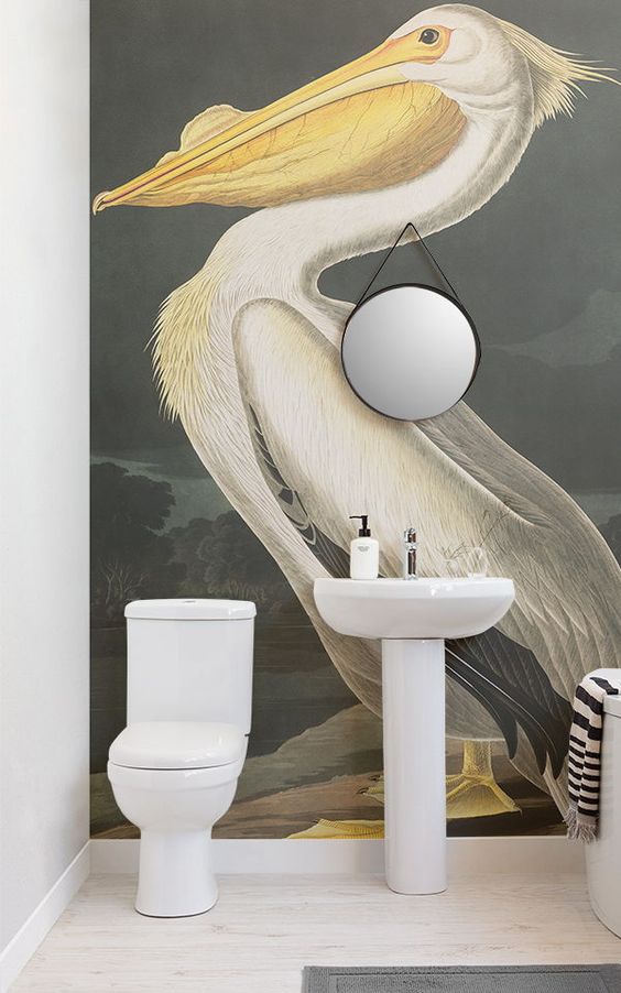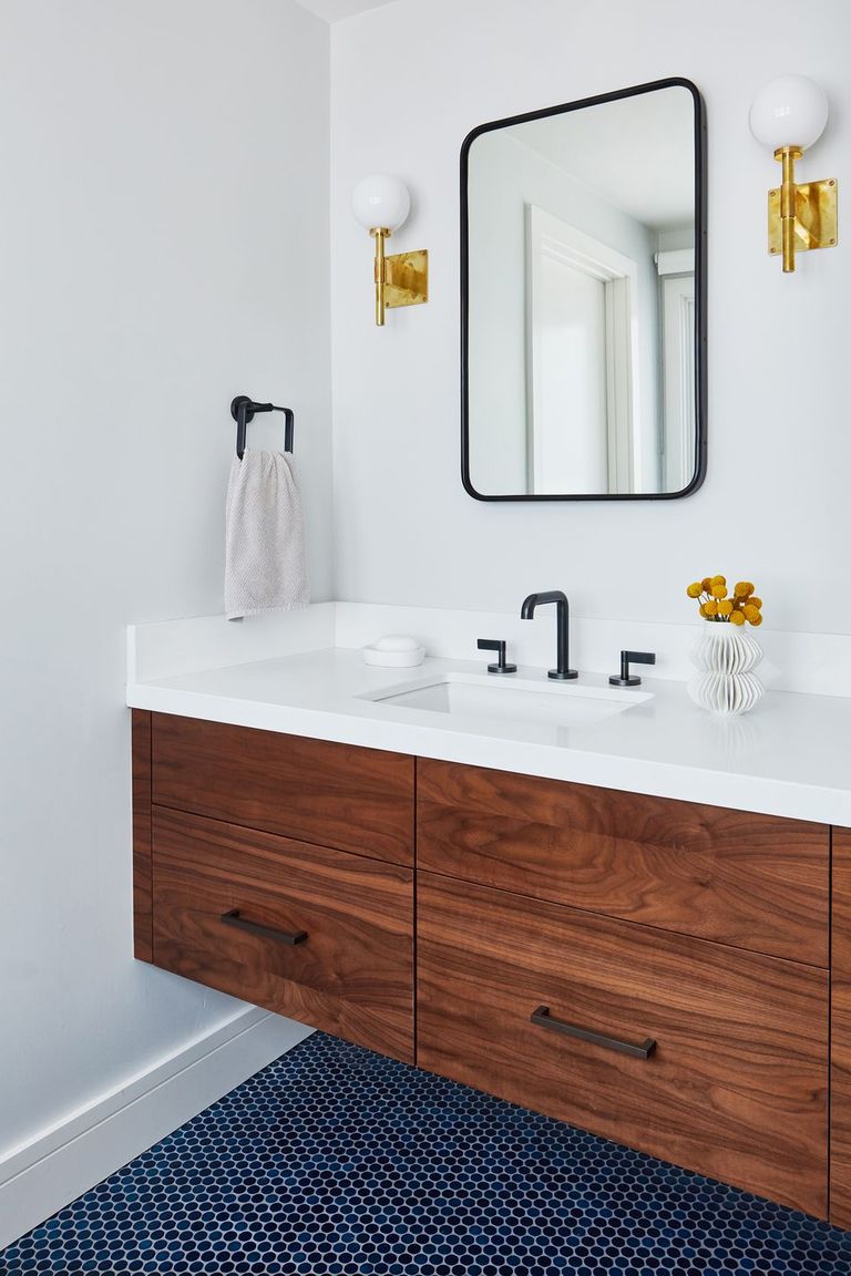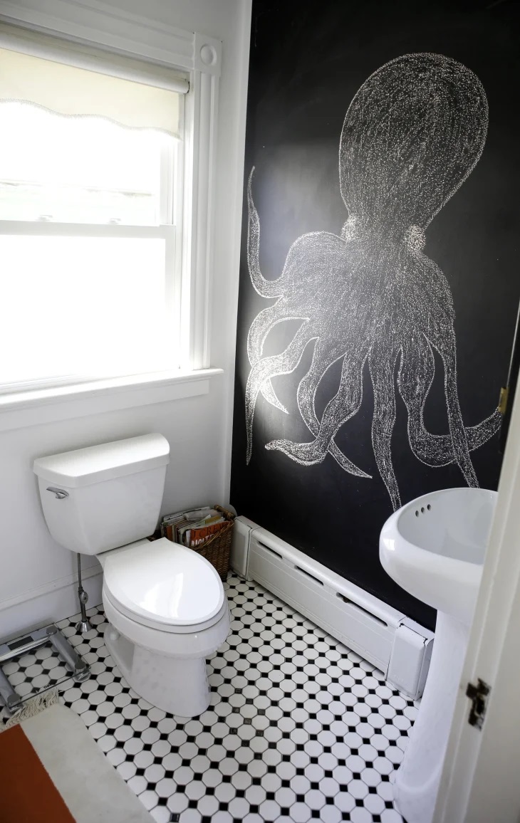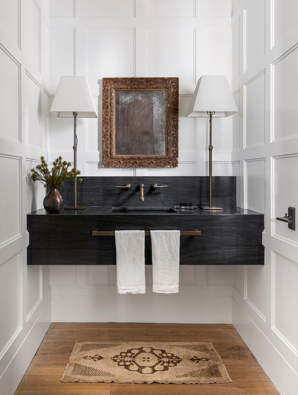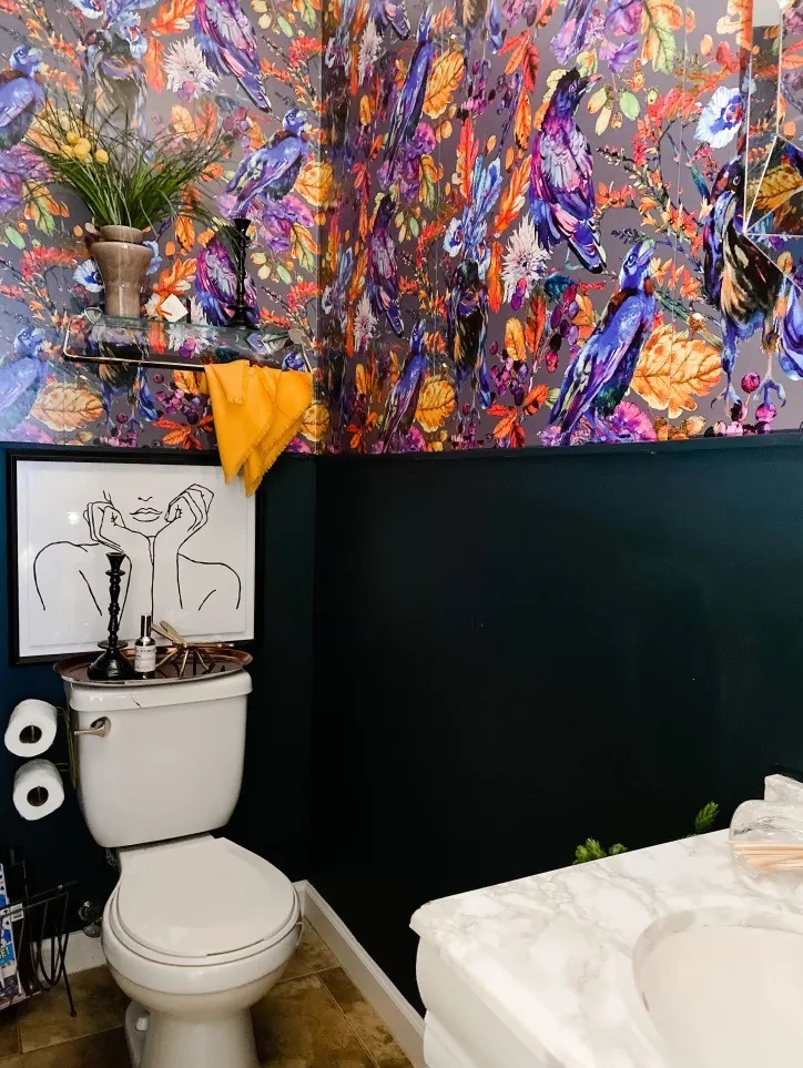 Pintar la pared trasera del baño pequeño en un color oscuro le da a la habitación una impresión de grandeza cuidadosamente acondicionada