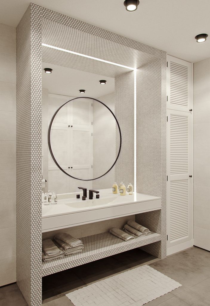 Un bonito baño pequeño con mosaicos en las paredes y el suelo. En el lado de almacenamiento, un mueble de lavabo doble y armarios con espejos para agrandar la habitación