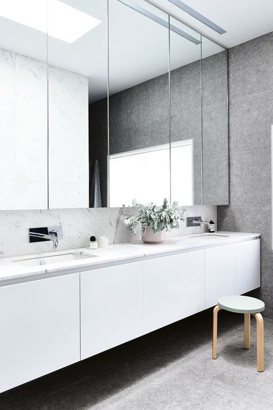 Este pequeño baño está completamente vestido de blanco con su mueble de doble lavabo ultra práctico y un espejo que te permite agrandar la habitación, una idea muy inteligente para poder ampliar este espacio que gracias al acierto en el uso del color logra también mucho encanto. Y si consideras que el blanco es demasiado frío, podrías añadir algún vinilo de color o también porque no colocar alguna que otra planta en el baño.