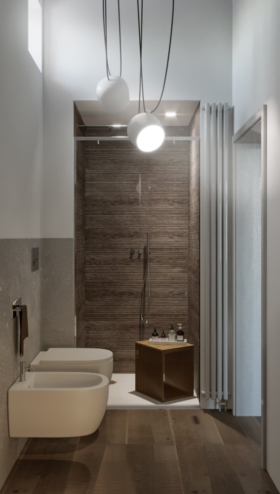 Una ducha italiana agranda un pequeño baño de madera y gris