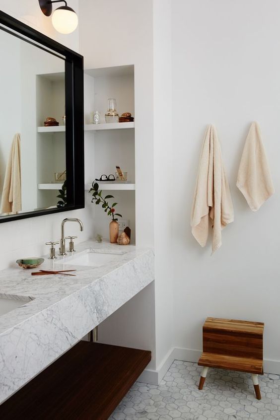En espacios reducidos todo lo que esté hecho a medida siempre nos va a hacer ganar puntos. Los estantes hechos para espacios inesperados, lo más profundos posible, solo para sostener un pequeño lavabo, son perfectos para un baño aunque este sea el baño de invitados. O incluso armarios empotrados en la pared, quizás encima del inodoro colocado en la pared corta.