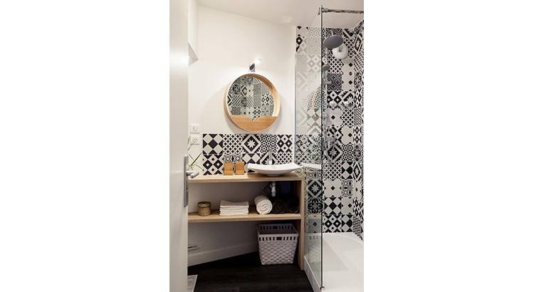 Optimización total del espacio en este pequeño baño donde los azulejos son el revestimiento principal. La pequeña bañera colocada en el hueco, el almacenamiento alto y el mueble de madera poco profundo, ahorran espacio. Una decoración de baño en blanco y negro donde cada elemento encuentra su lugar a través de un pequeño juego de color básico.