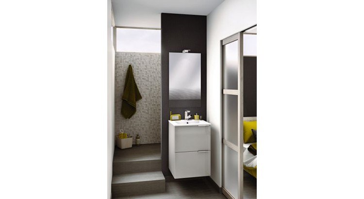 Un mueble compacto, una ducha italiana con paredes de azulejos blancos, un plato de ducha XXL de 120 cm de largo, un gran espejo, una combinación de accesorios para un baño pequeño con una decoración encantadora que optimiza el espacio.