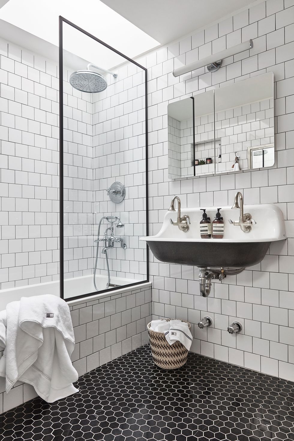 Un pequeño baño lleno de encanto con una mezcla de baldosas de imitación de parquet que contrastan con las baldosas blancas montadas en el techo para agrandar la estancia