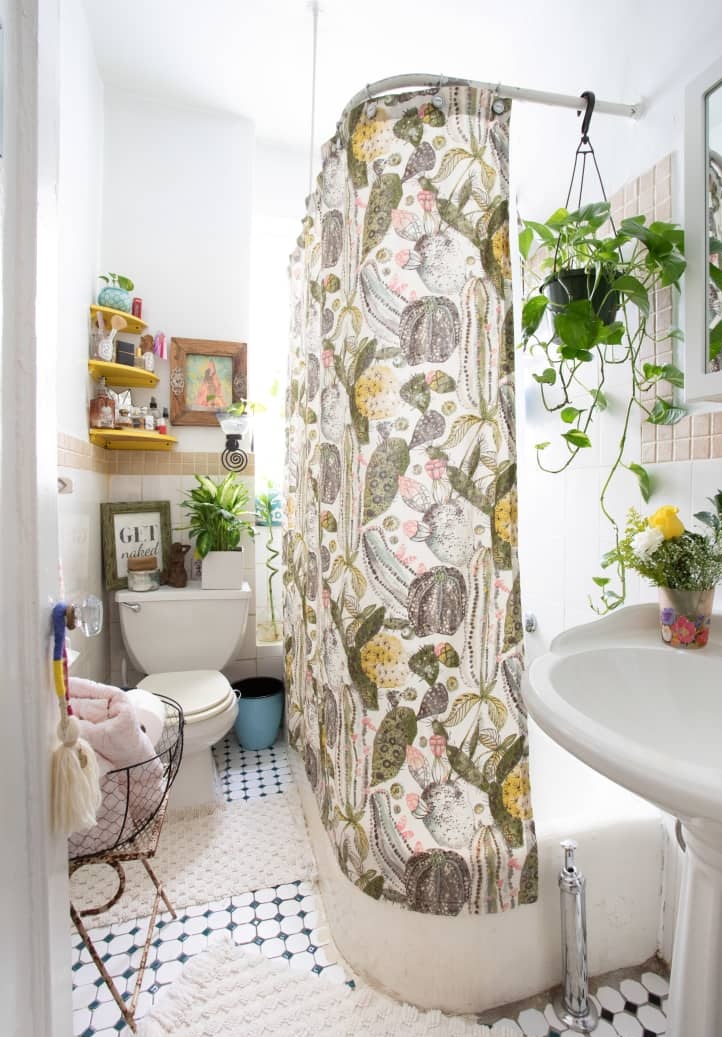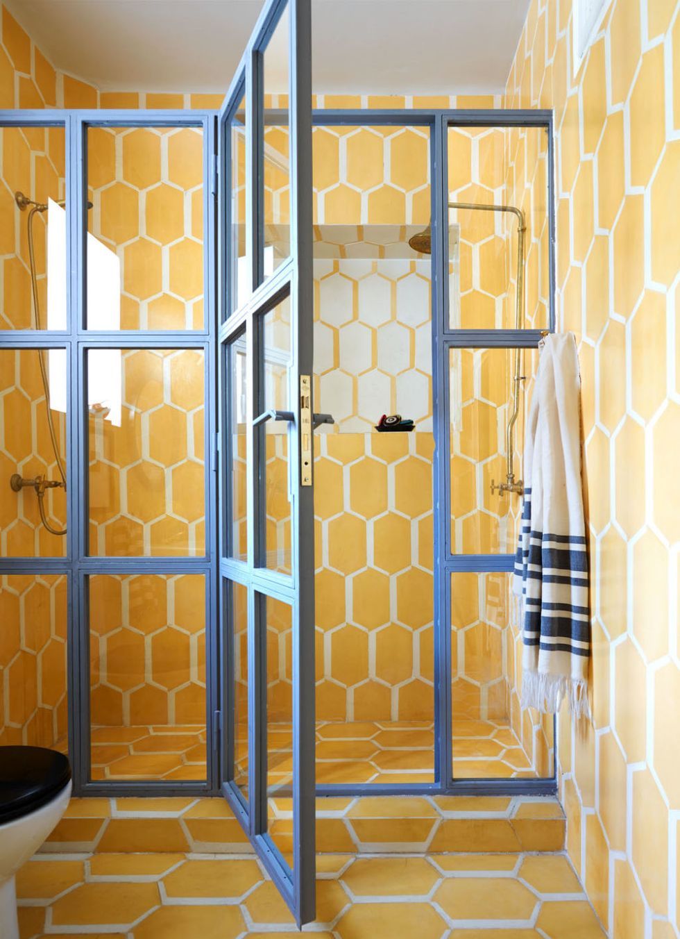 Esta solución es bastante habitual hoy en día en un baño estrecho y alargado. Perfecto si la ventana no está colocada justo en ese lado (aunque en el 90% de los casos es así). Preferible en cualquier caso aunque haya una ventana (solo hay que tomar precauciones para protegerla u optar por una ventana que no sea de madera). En esta foto, la mampara la ducha ha sido reemplazada por una hermosa cortina de baño. En algún lugar entre contemporáneo y rústico, es hermoso.