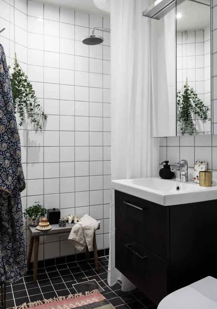 El baño alargado tiene suelo de PVC estilo metro de pellet negro, azulejos blancos en las paredes y un mueble de tocador elevado de madera con cajones dobles para aprovechar al máximo el pequeño espacio dedicado a él. Una cortina de ducha tan blanca como los azulejos colocados delante de la bañera preserva la privacidad cuando el baño está ocupado por dos personas. Un pequeño baño decorativo, equipado con lo mínimo, luminoso y perfectamente optimizado para satisfacer el uso diario.