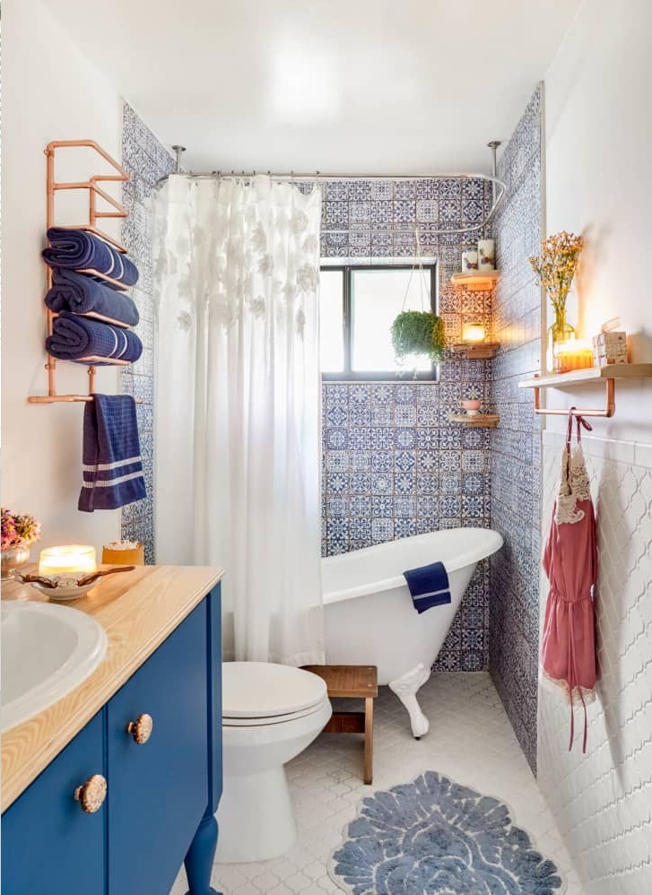 Los azulejos en este pequeño baño destacan por si solos con mucho encanto. Un baño donde además la bañera está instalada en un rincón y donde las unidades de almacenamiento se colocan en lo alto para una solución exitosa que de nuevo ahorra espacio.