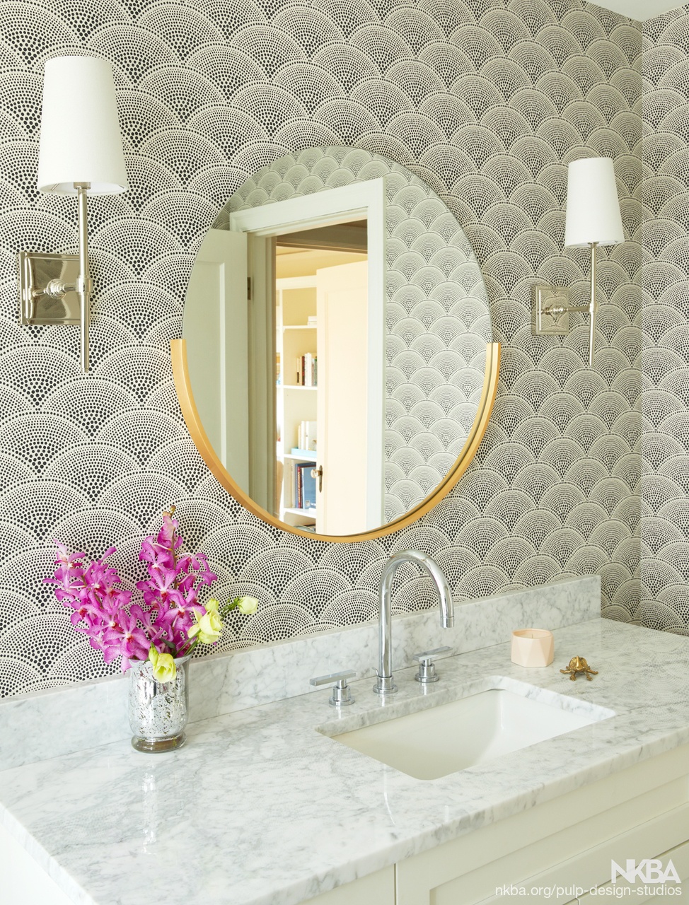 Un consejo de diseño es optar por paredes de espejos en lugar de un solo espejo centrado sobre el tocador. Si optas por un espejo empotrado en las paredes, debe considerar algunas cosas. Primero, no serán tan fáciles de limpiar (como sabes, los espejos pueden ser una molestia cuando se trata de dejarlos impecables). Sin embargo, harán que tu baño parezca enorme, haciendo una verdadera declaración de intenciones en el baño. Es un movimiento audaz, por lo que depende completamente de usted.