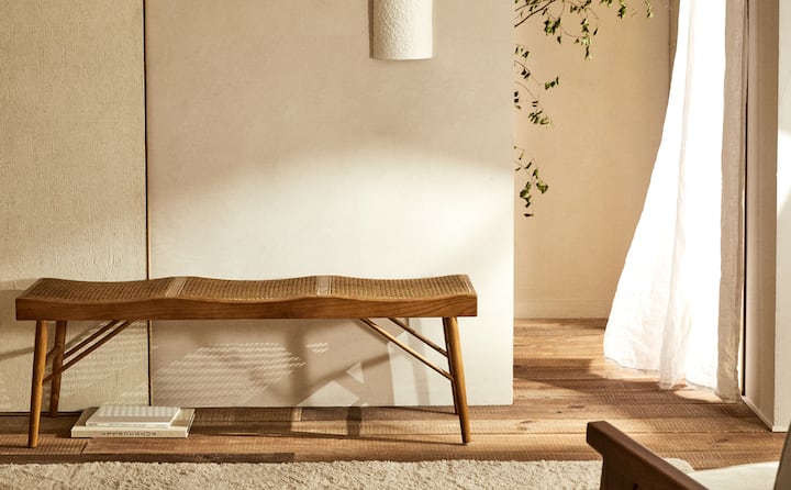Y si tienes algo más de espacio, en lugar de una mesita de madera te puedes decantar por un banco de madera como el que vemos a continuación y que te puede hacer las veces de una mesita perfectamente tal y como lo propone Zara Home en su nuevo catálogo.