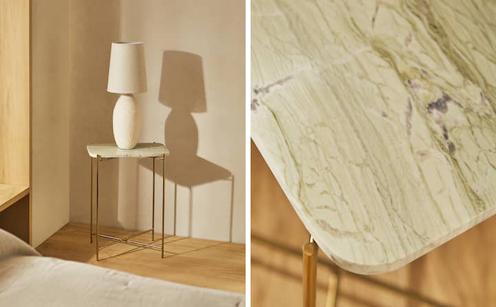 Muchas son las propuestas de mesitas de noche que podemos encontrar en el nuevo catálogo de Zara Home pero sin duda alguna tenemos que comenzar mostrando aquellas que nos parece que tienen un diseño más moderno e innovador. Es el caso de la mesita de mármol que vemos a continuación. Un tipo de mesita bastante rústico pero que a la vez innova por su diseño. Con una mesita como estas conseguirás renovar por completo, el aspecto de tu dormitorio.