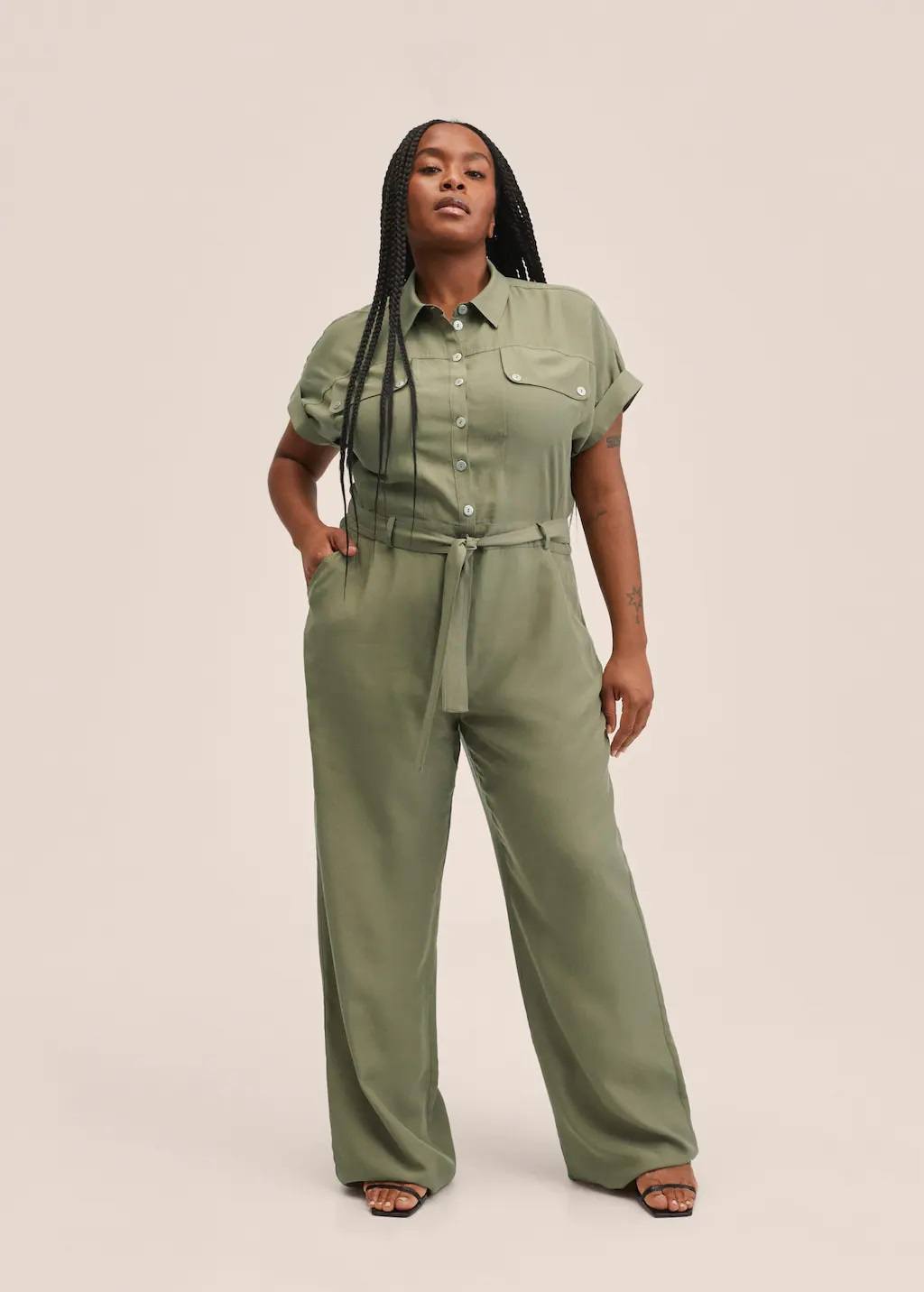 Los monos están también muy presentes en el catálogo de Mango para mujer Tallas Plus primavera verano con modelos que se presentan en diseños clásicos y elegantes, en color negro y escote cruzado así como el mono estampado de cuadros vichy que marca ahora tendencia.