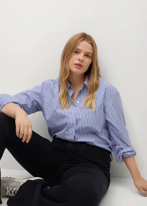 En cuanto a blusas, el Catálogo de tallas grandes Violeta by Mango para mujer Otoño Inviernose llena de aquellas que más se llevan tal y como es el caso de las que son del tipo «regular fit» con colores como el azul o estampadas de rayas así como las de algodón.